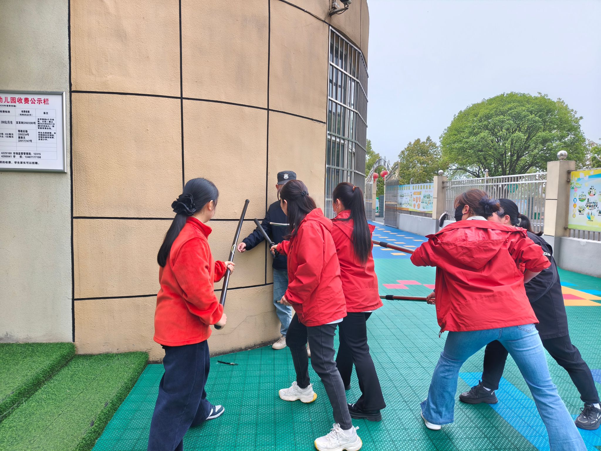 危急时刻,门卫率先冲上前阻拦,几名教师迅速取来防卫八件套,与门卫并肩作战,合力与“歹徒”展开对峙和周旋,死死挡住“歹徒”前进的路线,坚决不让其靠近幼儿。与此同时,负责应急联络的教师,第一时间跑到值班室,按下园内一键报警器,快速向公安部门上报险情,请求支援。