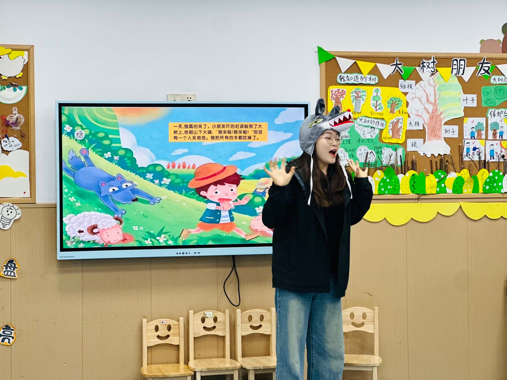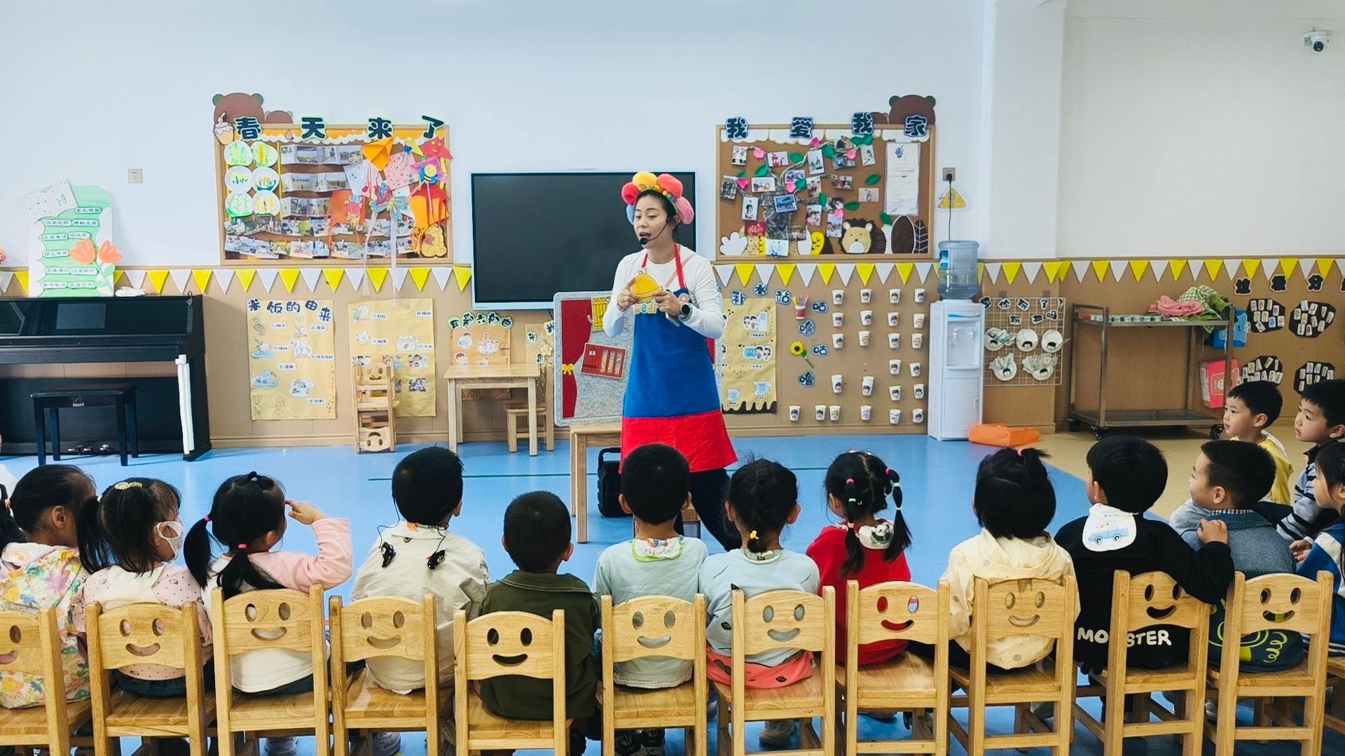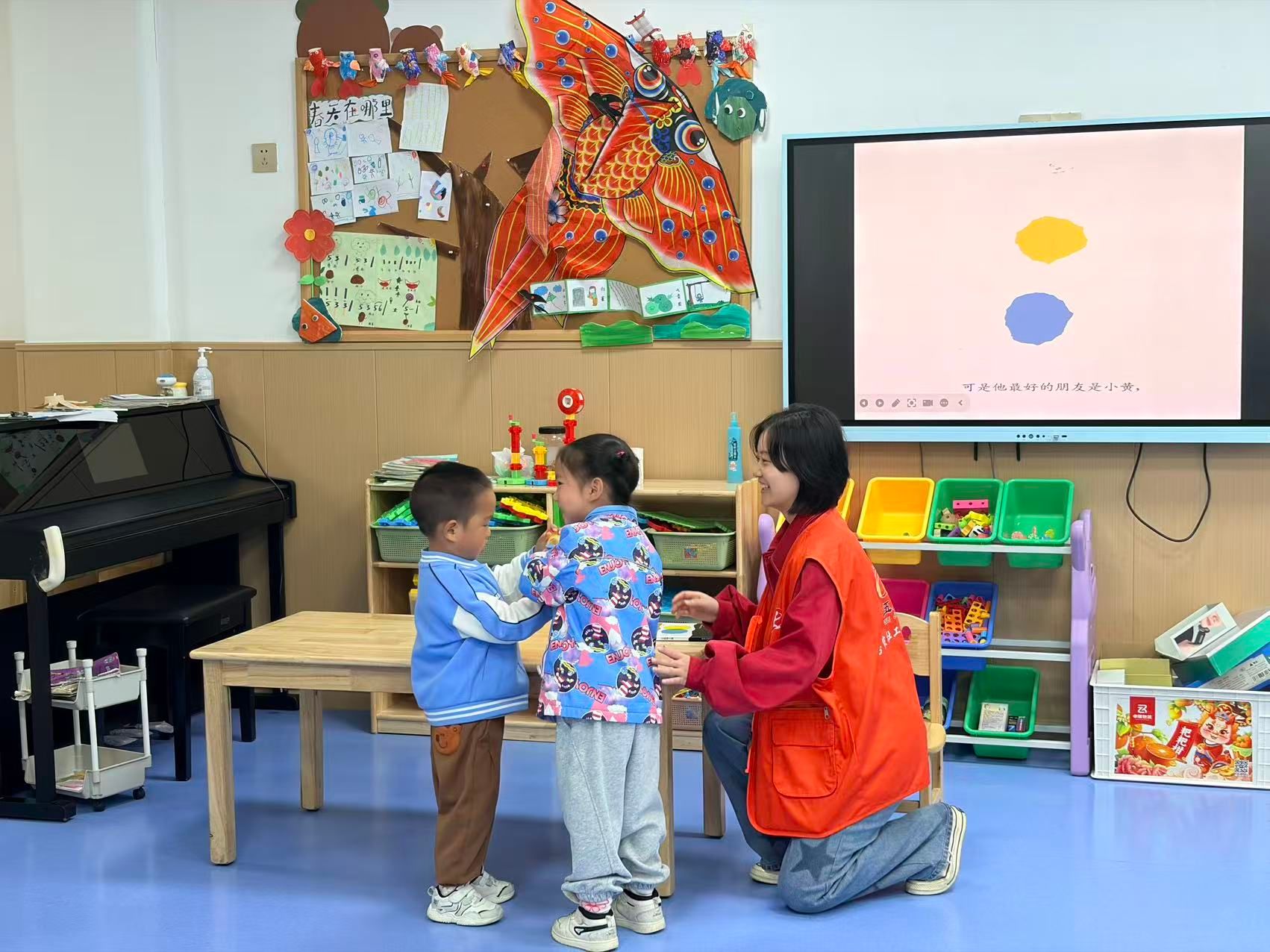 活动现场,精心布置的阅读区摆满了各类绘本,处处洋溢着书香气息。各班教室被绘本、小书签装点得童趣满满,受邀而来的家长与社区工作人员提前备课,带着精心挑选的绘本走进各班课堂。《小黄与小蓝》《一只聪明的笨狼》《小猴的出租车》……一个个充满童趣、饱含安全教育和习惯养成的经典绘本故事,在“故事老师”绘声绘色的讲述中变得鲜活生动。