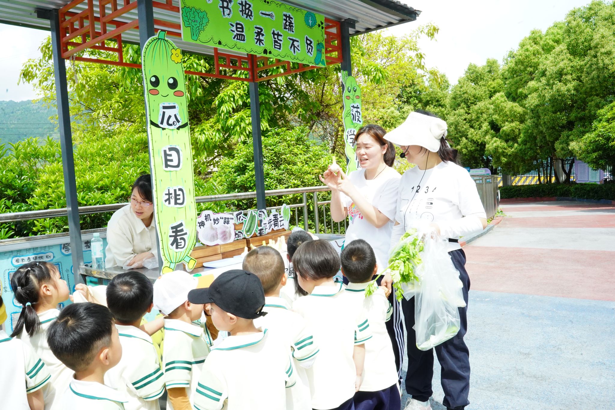 活动现场精彩纷呈。孩子们登台演绎《司马光砸缸》《三只小猪》《龟兔赛跑》等经典绘本剧,充满童真童趣。“以书换蔬”环节中,孩子们用闲置的好书兑换新鲜蔬菜,让图书漂流起来,循环利用,在分享中收获快乐。