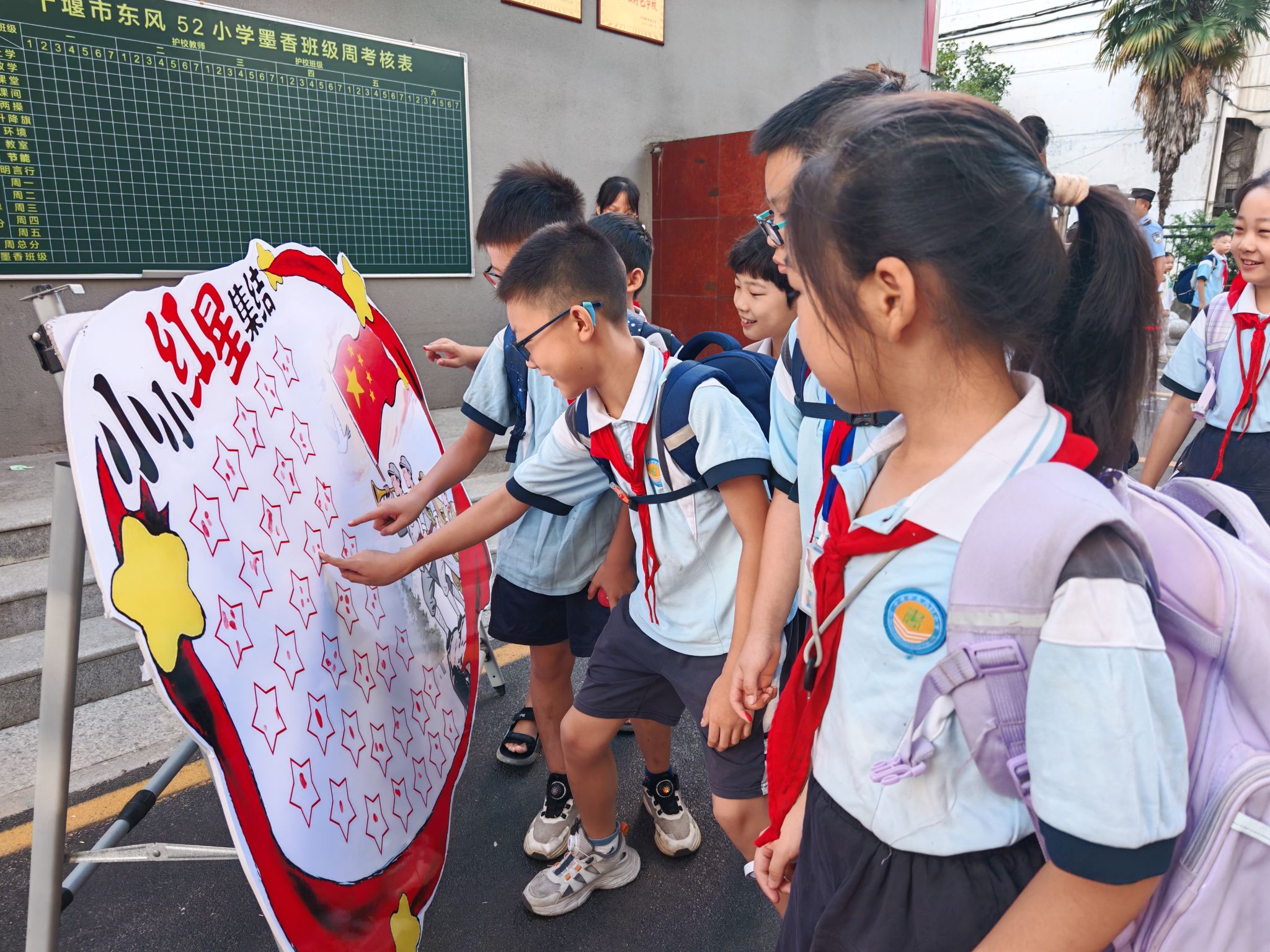 早晨7:30,迎新活动在学校大门正式启动。书法老师校与题写的学生共同为焕然一新的手写校名揭牌,标志着校园文化由师生共创共享的新开端。随后,学生们在“红星集结墙”上郑重按下手印,汇聚成一颗闪亮的红星,宣告自己是红色队伍中的一员。