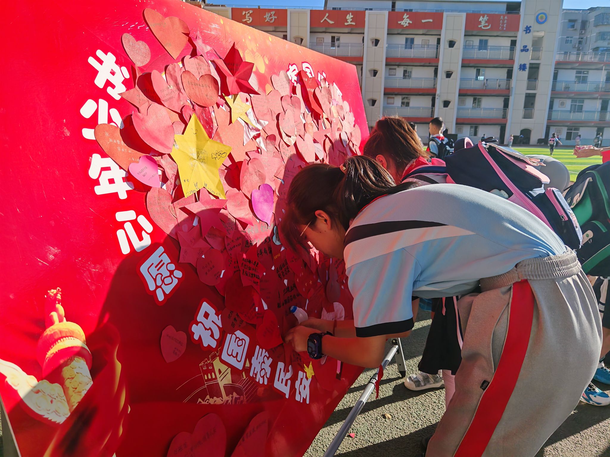 沿着墨缘前行,学生们跨越书写着“坚韧不拔”“忠诚爱国”等精神品质的“障碍”,在互动中深刻感悟红色精神的内涵。在“祖国山河”地图展板前,同学们兴奋地贴上小旗,标注自己假期的足迹,感受祖国的辽阔与壮美。枫杨树下的“家国心愿树”很快贴满了学生们亲手书写的心形与红星祝愿卡,承载着孩子们纯真而宏大的家国梦想。