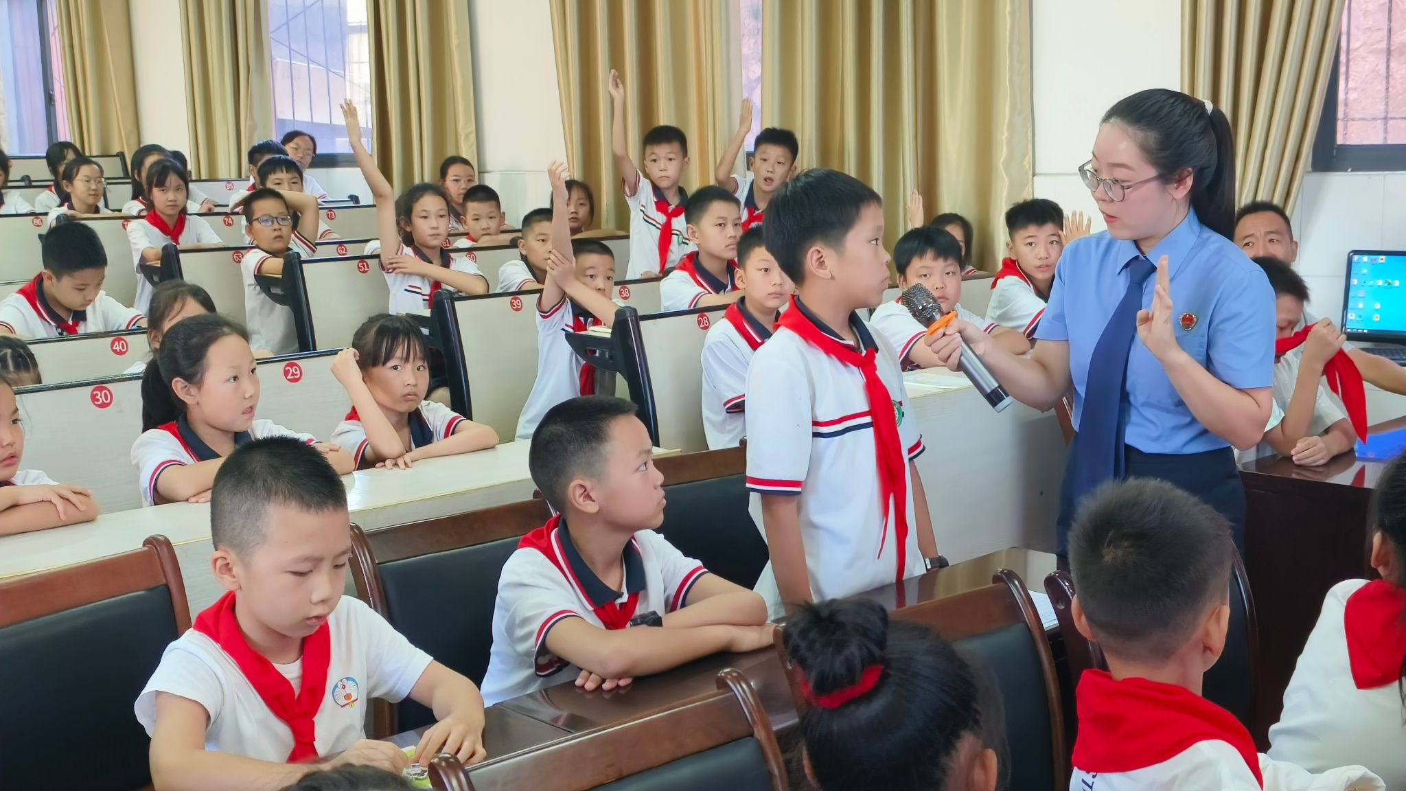 在互动环节,干警们抛出法治问题,邀请学生分享课堂所学与感悟。同学们积极举手、踊跃发言,在交流中深化对法律知识的理解,现场气氛热烈活跃。活动尾声,干警还向师生发放未成年人保护知识宣传手册,进一步延伸法治教育效果。
