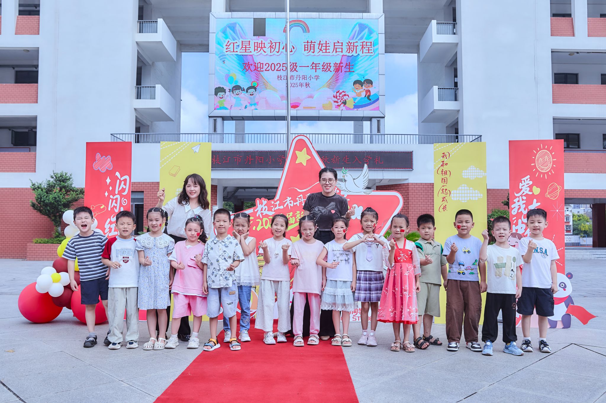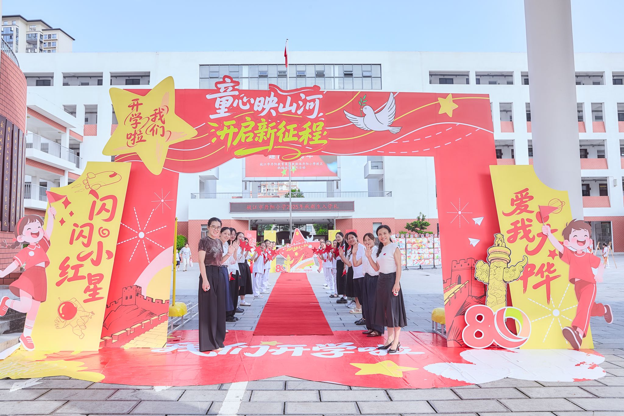 入学礼围绕“闪闪小红星,热爱大中国”展开:“薪火门”迎新生,红领巾小导游讲先锋故事,亲子共闯“重走长征路”挑战。