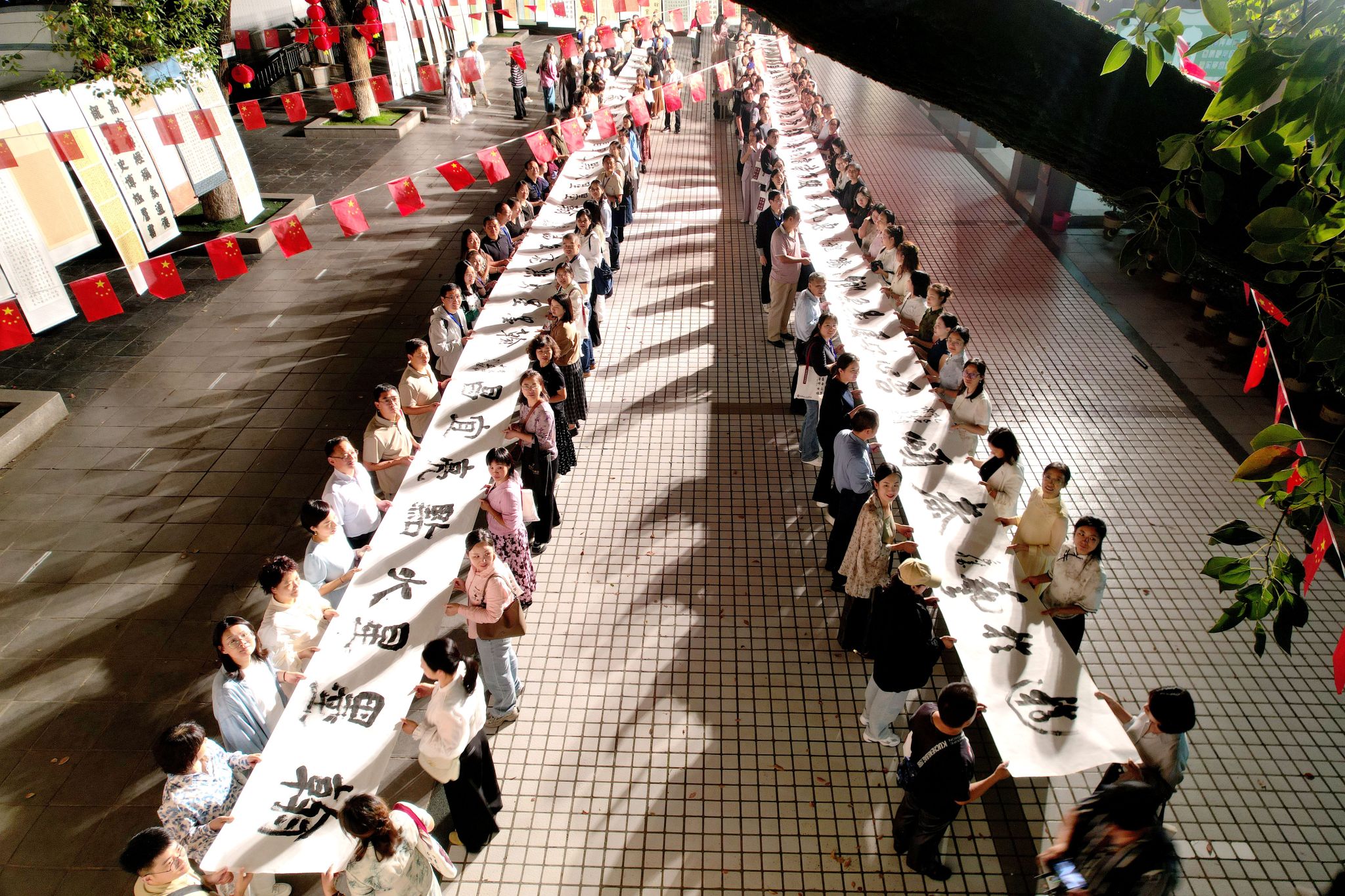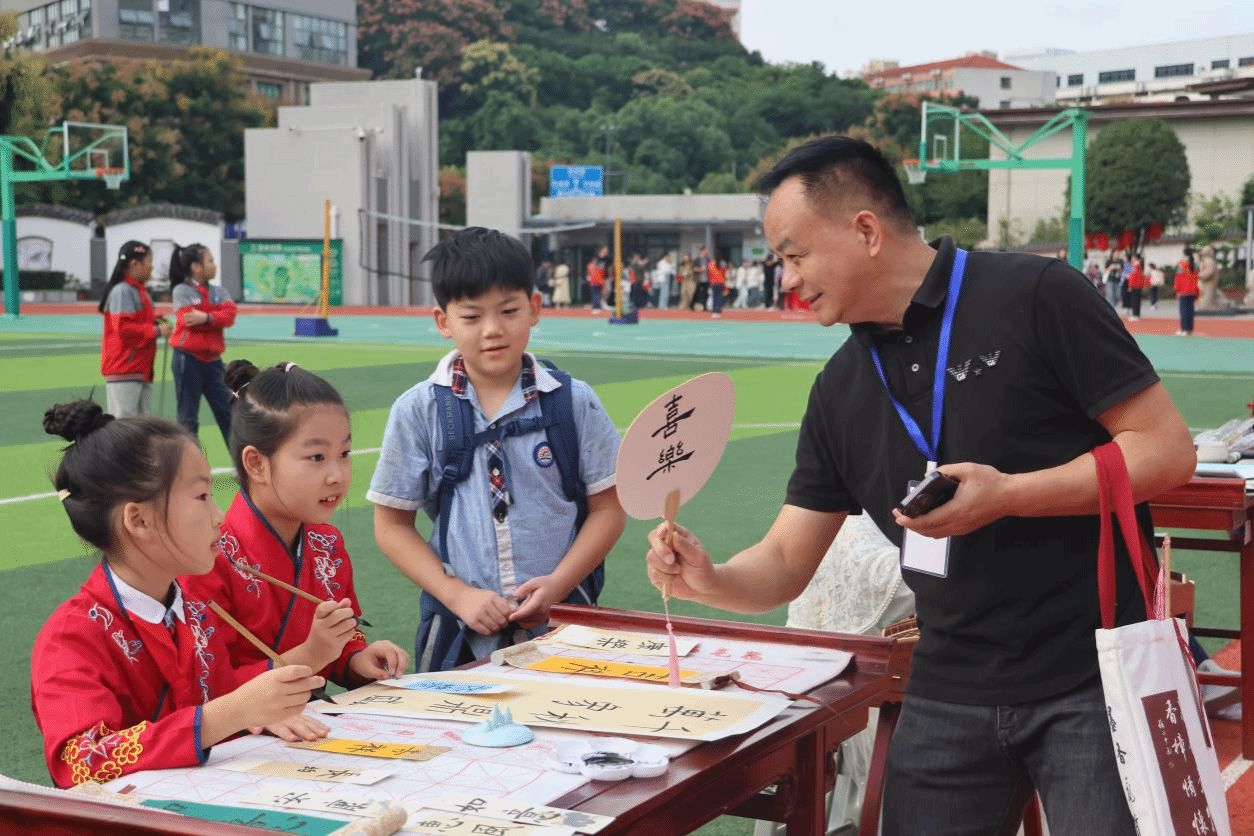 尤为引人注目的是“百名书法家共书百米长卷”环节,书法名家与教师们齐聚实小中南校区香樟园,挥毫泼墨,畅叙情怀,将校园的艺术氛围推向高潮。同时,该校“墨香雅韵”书法社团的孩子们现场展示了创作在条幅、扇面、伞面、书签上的书法作品,并赠予与会教师,其精湛的技艺和无限的创意赢得了广泛赞誉,成为伍家岗区书法教育“从娃娃抓起”并卓有成效的生动缩影。