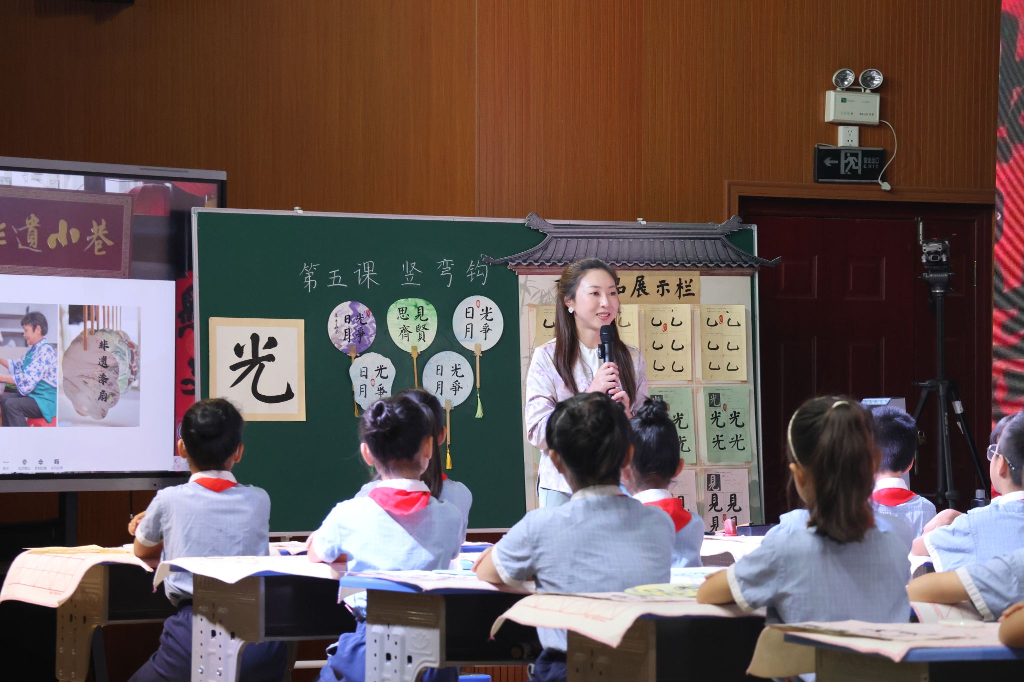 在核心环节的“湖北好课堂”现场展示中,伍家岗区本土教师的优异表现尤为亮眼。来自该区实验小学北山校区的杨春华老师执教的《竖弯钩》一课,匠心独运地将宜昌本地特色景点、历史名人与书法元素巧妙融合,创设生活化情境,引导学生在“练-写-创”的递进过程中,不仅掌握了笔墨技巧,更深刻感受到非遗文化与书法艺术的无穷魅力。这堂课充分展示了伍家岗区在书法教学与地方文化融合探索上的特色与深度。随后,来自黄冈、武汉、荆门、荆州等地的优秀教师也同台竞技,呈现了一节节底蕴深厚、韵味悠长的示范课,而实小中南校区的学生们在课堂上的专注聆听与积极互动,也展现了该区学子良好的书法素养和精神风貌。
