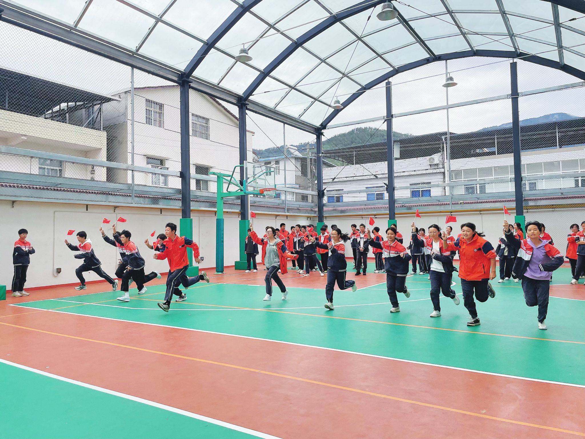 体育场上,“国防教育强体魄”与“国旗迎面接力赛”的热潮点燃青春活力。体育教师先以“国防小课堂”开场,通过“国防知识问答”“身边的国防故事分享”等互动环节,让同学们轻松掌握国防常识、树立国防意识;随后的“国旗迎面接力赛”更是将活动推向高潮——各班队员手持鲜红的小国旗,在赛道起点整装待发,随着哨声响起,队员们奋力奔跑,飘扬的国旗与清脆的呐喊声交织,成为校园里最动人的“爱国风景线”。这场比赛不仅锻炼了同学们的身体素质,更让团队凝聚力与爱国情怀在奔跑中凝聚。