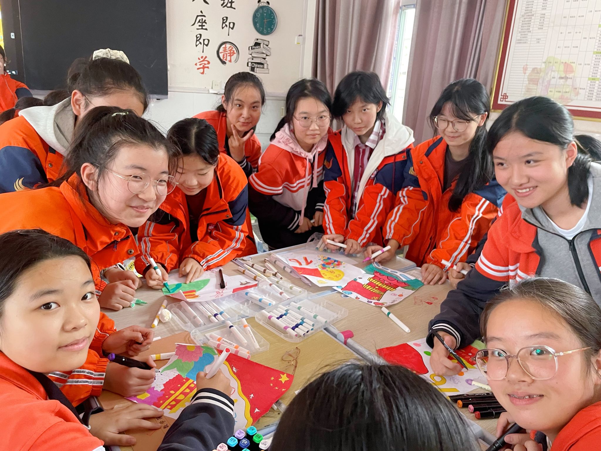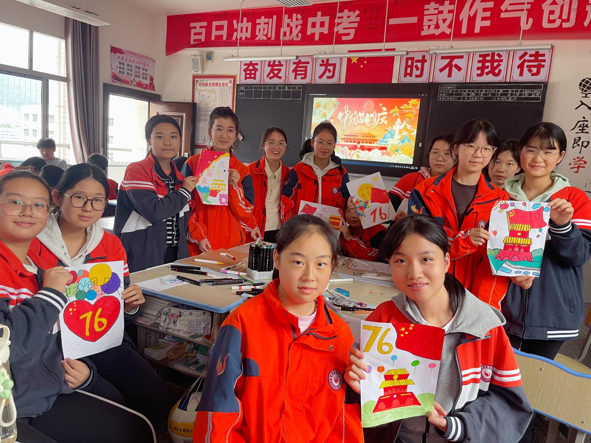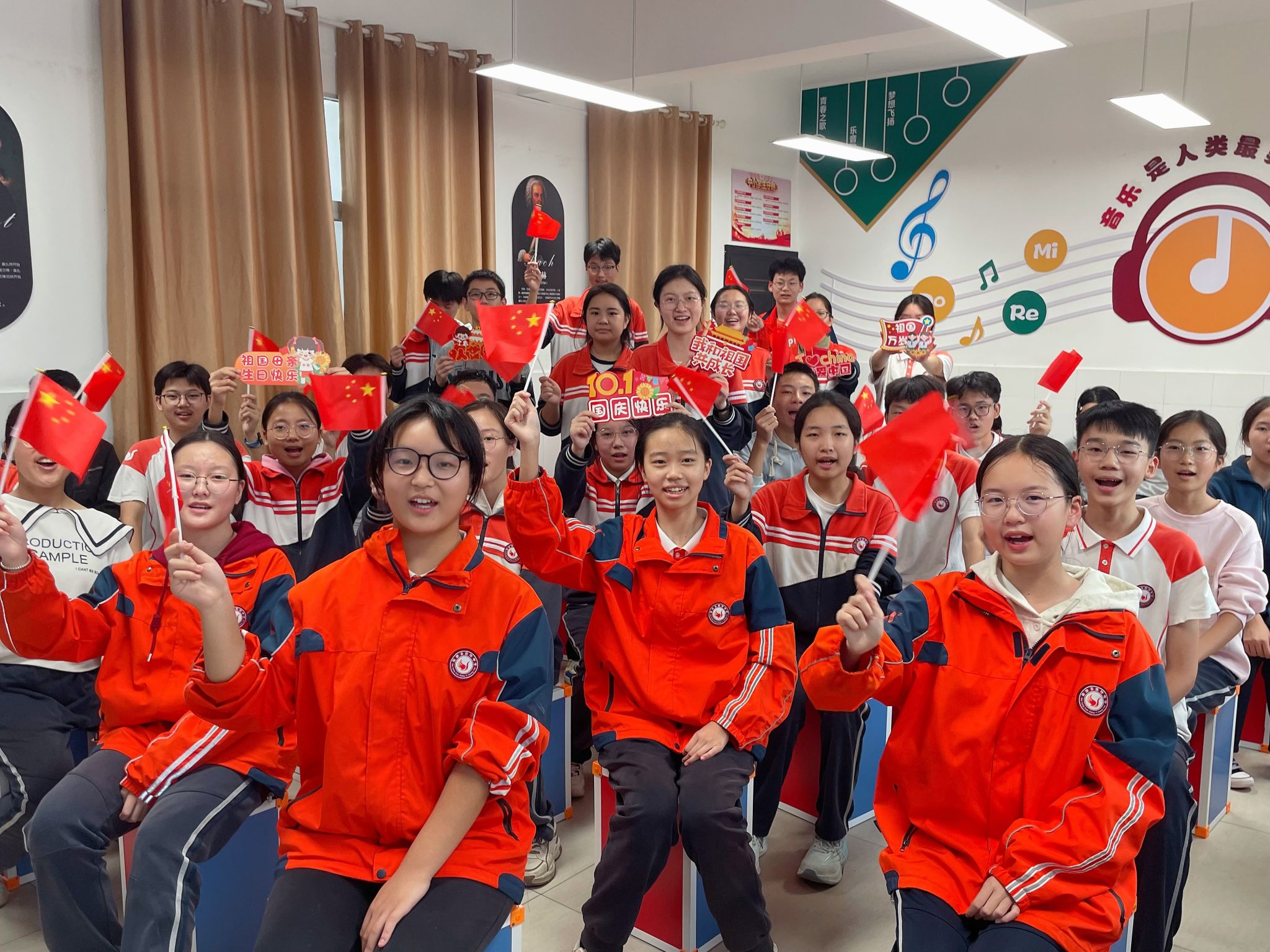 音乐课堂里,“红歌嘹亮颂祖国”的旋律点燃爱国热情。当《我和我的祖国》的前奏在教室响起,同学们纷纷昂首挺胸,用清亮的歌声传递对祖国的赤诚;随后的“红歌接龙”环节,各班同学踊跃接唱经典红歌,课堂瞬间化作“红色音乐厅”。音乐教师结合节日背景,生动讲述《歌唱祖国》《没有共产党就没有新中国》等歌曲背后的历史故事,让同学们在旋律与史实的交融中,深刻体会红歌承载的民族记忆,民族自豪感与责任感在歌声中悄然升华。