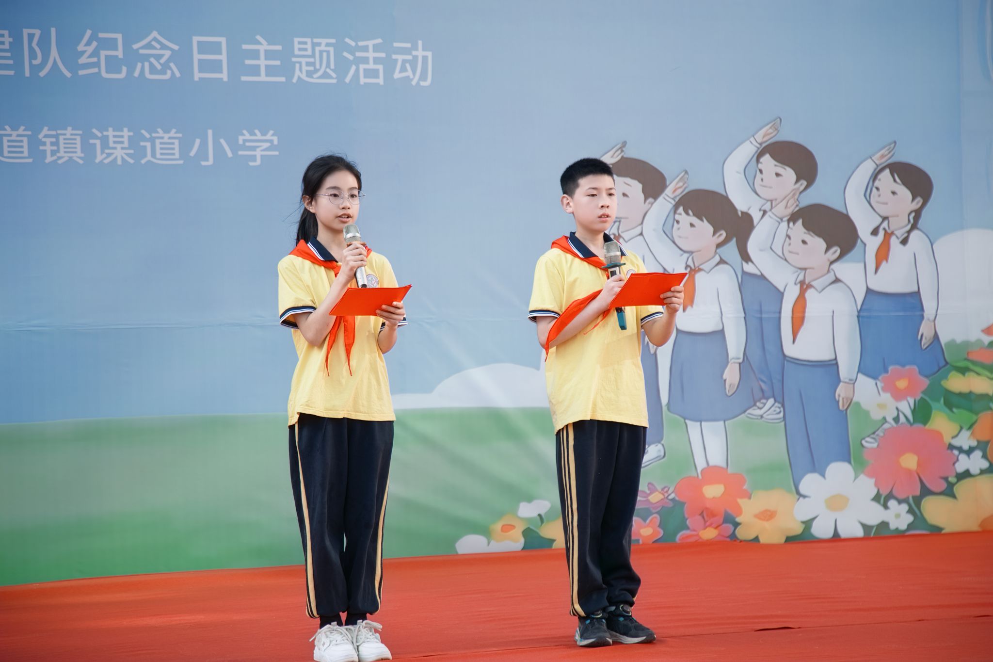 队旗飘扬,歌声嘹亮。活动伊始,出队旗、唱队歌的环节便营造出庄严而热烈的氛围。在星星火炬的队旗下,一批新队员光荣地加入了中国少年先锋队。他们昂首挺胸,高举右拳,用稚嫩而坚定的声音许下誓言,宣告着红色基因的传承与延续,正如誓言中所蕴含的精神——“传承的红永不褪色,那是先辈热血在岁月长河中闪耀的底色”。