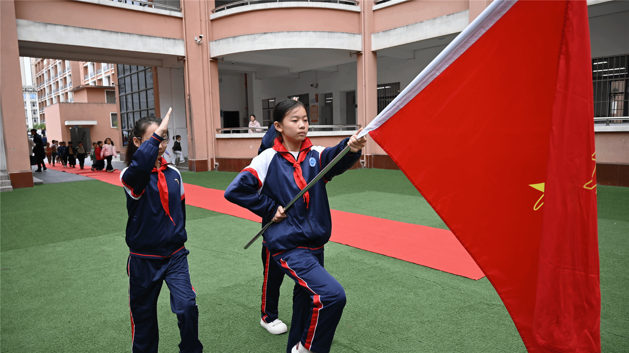 随后,大队辅导员带领全体少先队员呼号:“准备着,为共产主义事业而奋斗!”全体队员齐声回答:“时刻准备着!”最后,队旗在《退旗曲》的旋律中缓缓退场,全体少先队员再次敬礼。