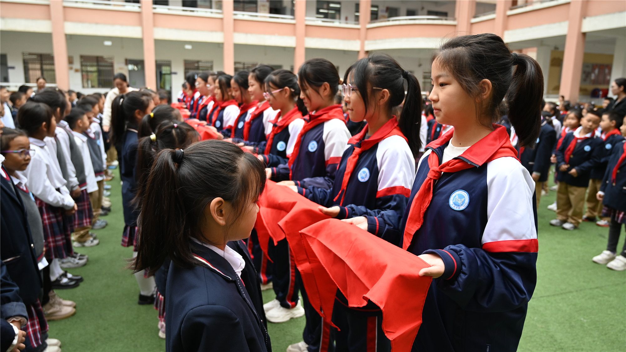 在庄严的氛围中,大队辅导员宣读新队员名单。经过各中队的推荐和学校少先队大队的审核,本次共有248名同学光荣地加入中国少年先锋队组织,正式成为光荣的少先队员。伴着《红领巾飘起来》轻快又充满力量的旋律,新队员踏着红毯入场,六年级优秀少先队员代表为新队员佩戴红领巾。面向鲜艳的大队旗,新队员在队旗下庄严宣誓,老队员重温誓词。