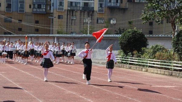 最后,大队辅导员领呼“准备着——为共产主义事业而奋斗!”,队员们齐声回应“时刻准备着!”,声音铿锵有力。鼓号队奏响《退旗曲》,活动在庄重的退旗仪式中落下帷幕。