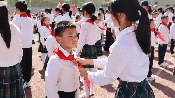 在这庄严而又隆重的时刻,二年级新队员正式加入少先队。六年级优秀队员代表为新队员佩戴红领巾,这一“接力”时刻,传递的是少先队的精神传承。大队长杨锦珩带领新队员庄严宣誓,誓言响彻校园。