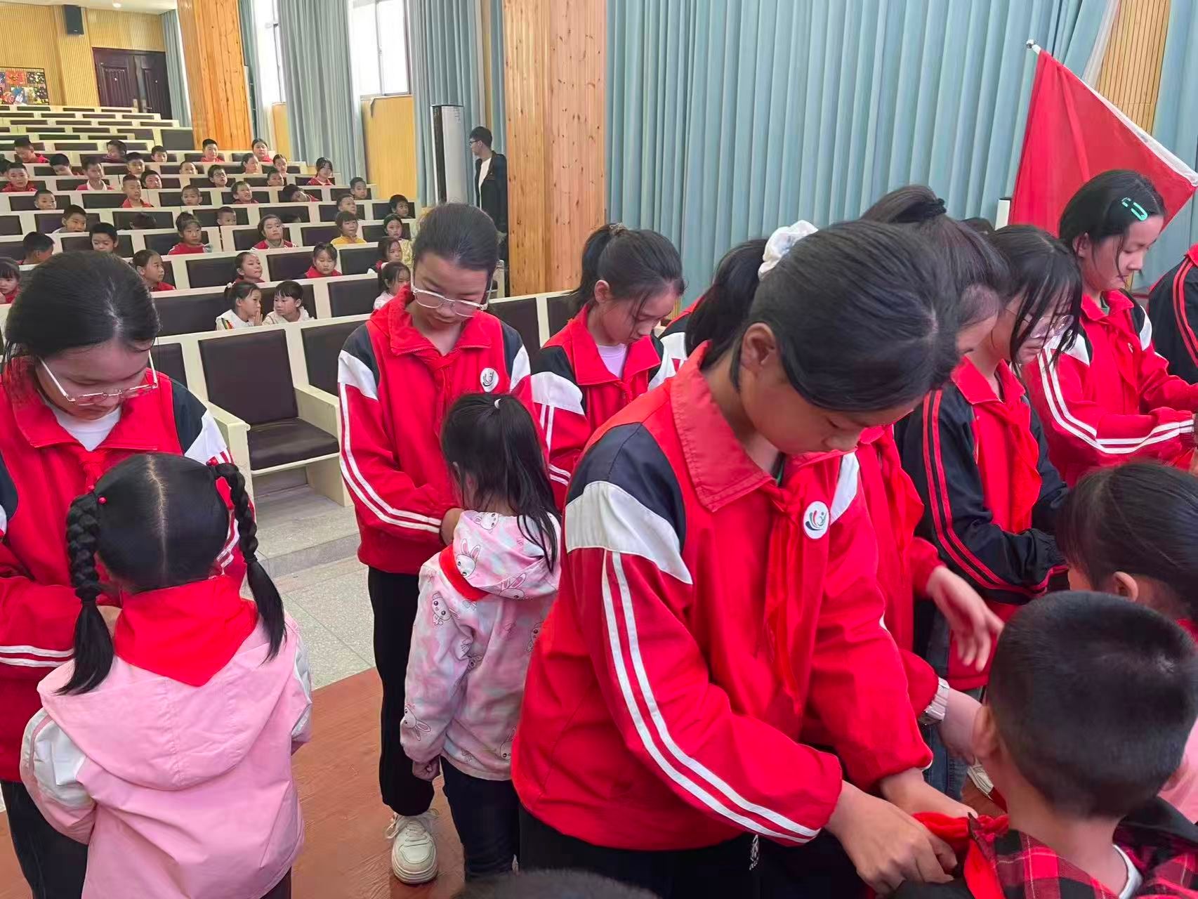 五年级老队员代表手持鲜艳的红领巾,细心地为新队员们佩戴整齐。新老队员互敬队礼的瞬间,红色基因与责任使命完成了温暖的交接。在大队长的带领下,新队员们面向队旗高举右拳,庄严宣誓:“我热爱中国共产党,热爱祖国,热爱人民,好好学习,好好锻炼,准备着为共产主义事业贡献力量!”铿锵的誓言响彻校园。