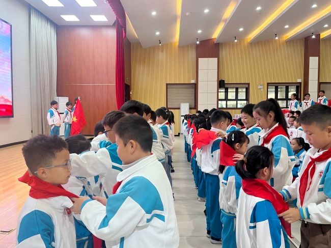 随后,大队辅导员走上台前,郑重宣读新队员入队名单。当念到名字时,123名新队员依次昂首挺胸走出队列,他们胸前佩戴的红领巾鲜艳夺目,眼中满是激动与自豪。在老队员的协助下,新队员们再次整理红领巾,确保每一个结都系得端正规范。这抹红色不仅是少先队员的身份象征,更是革命精神的传承纽带,承载着对少年儿童“从小学先锋、长大做先锋”的殷切期望。