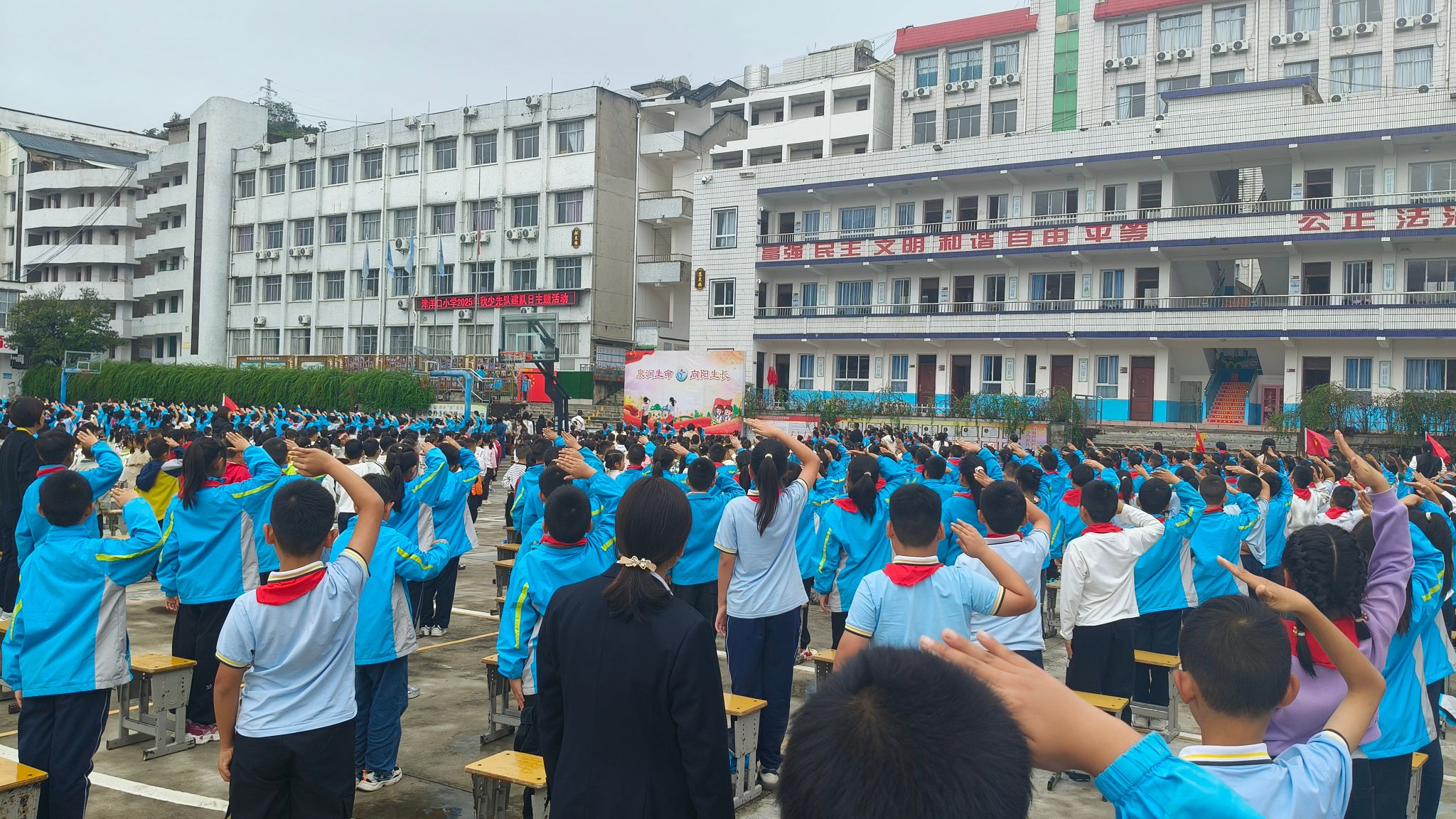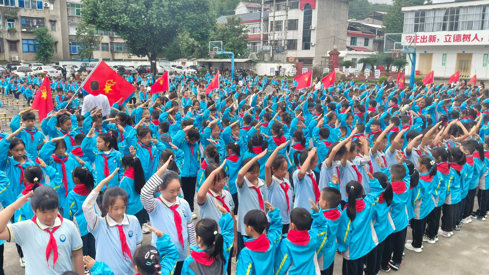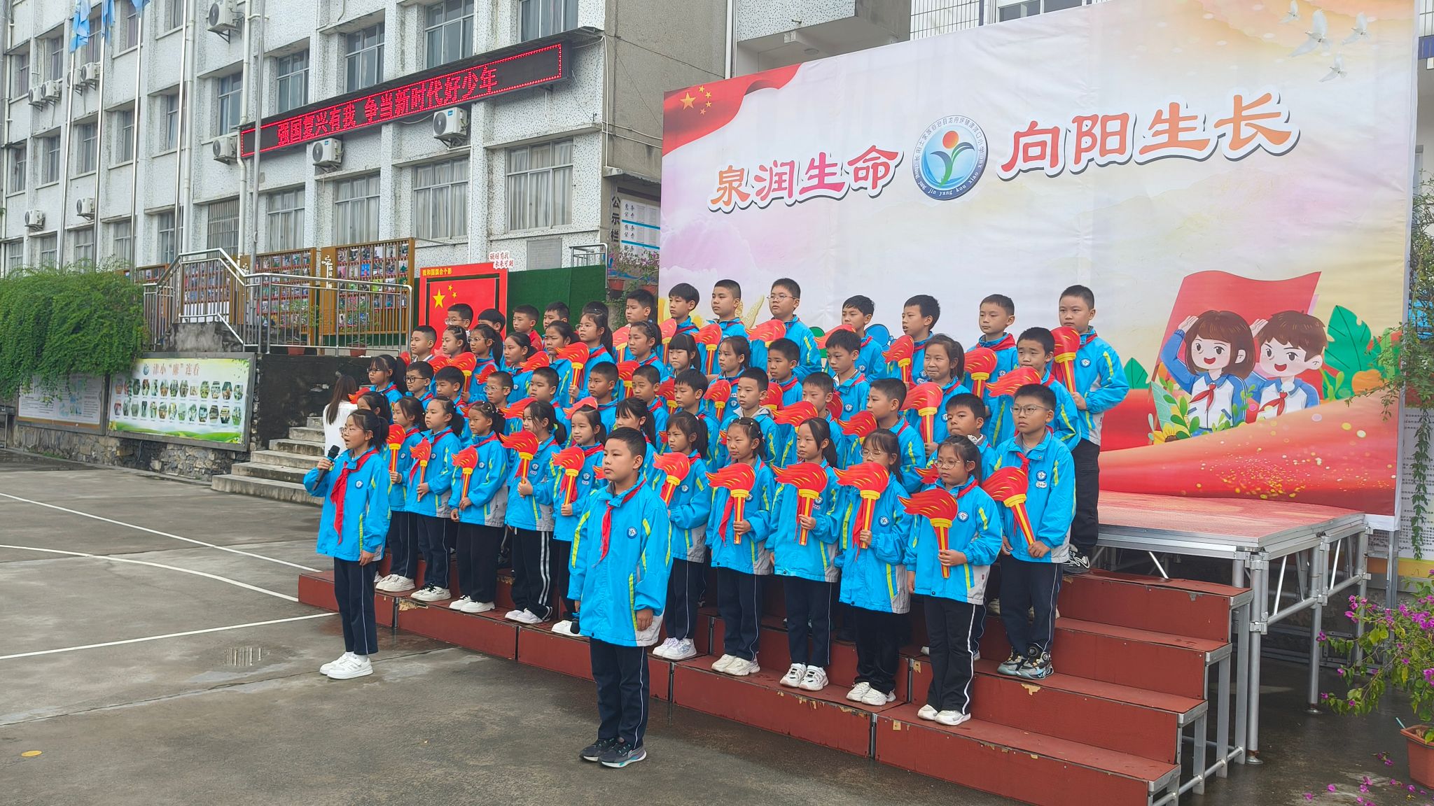 在庄严的国歌声中,活动拉开帷幕。出旗曲响起,大队旗迎风飘扬,全体队员高唱《中国少年先锋队队歌》,歌声激昂,振奋人心。