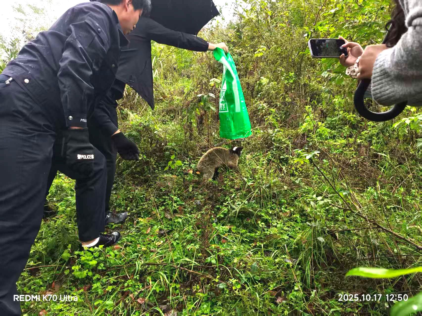 经过一天的悉心照料,花面狸体力明显恢复,精神状态好转,经评估已具备野外生存能力。10月17日下午,竹坪乡政府、派出所与野保站工作人员共同选择了一片远离人居、生态良好的林地,将其放归。笼箱打开片刻,它敏捷地跃入丛林,重返自然家园。