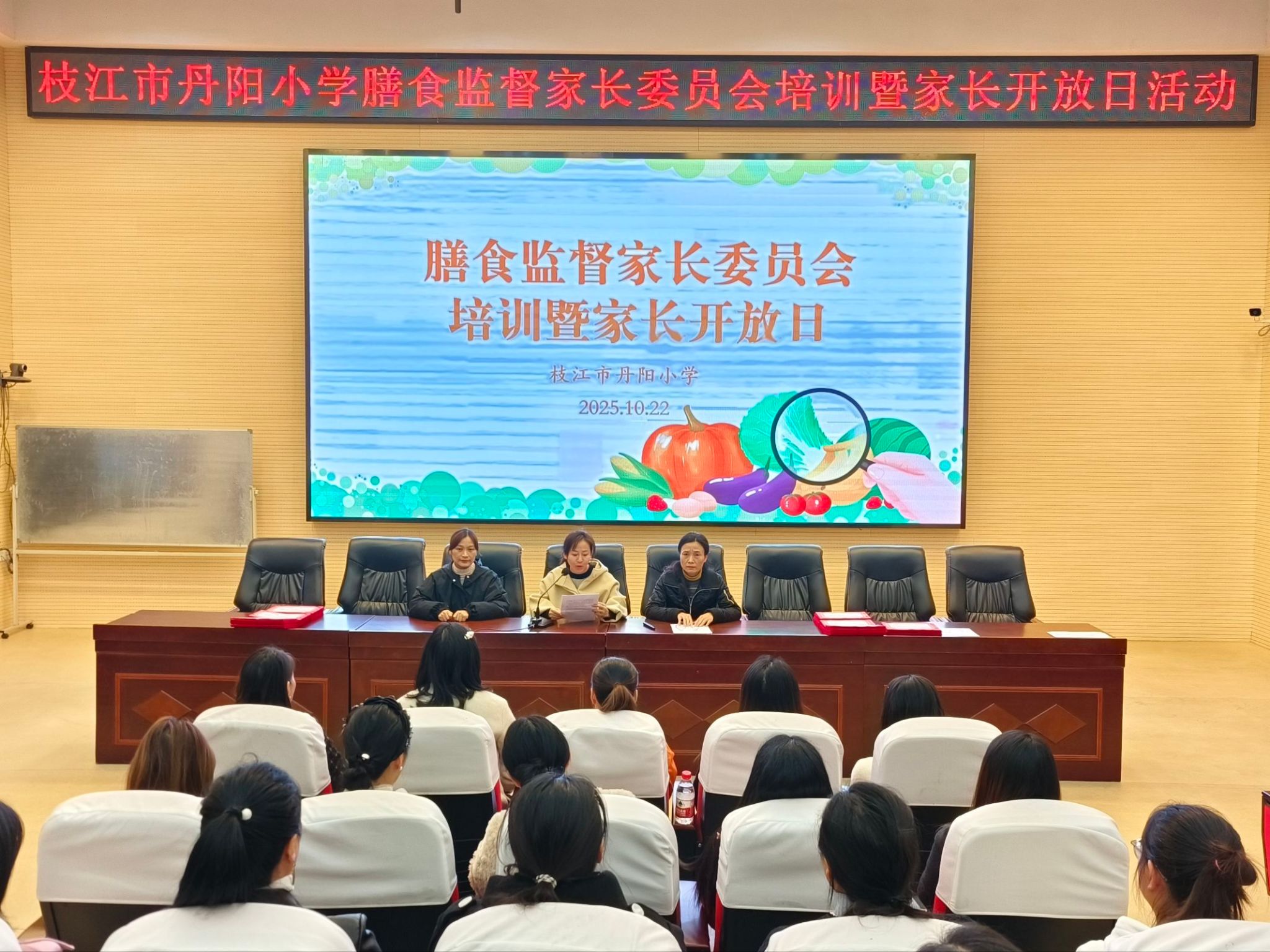 2025年10月22日上午,枝江市丹阳小学成功举办膳食监督家委会培训暨家长开放日活动,各班家长代表、膳食监督家委会成员与学校领导、教师代表共同参与,围绕“‘味’爱同行,共‘膳’未来”主题展开本次活动。