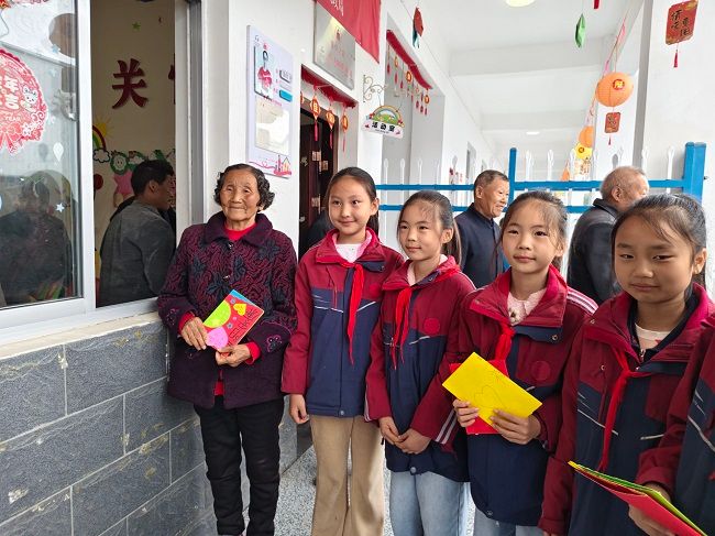 活动前期,同学们精心构思、巧手制作,一张张色彩鲜艳的贺卡上,既有稚嫩的绘画,又有工整的祝福话语,每一笔都饱含着对老人的敬爱之情。活动当天,在老师的带领下,同学们带着亲手制作的贺卡来到老人身边,甜甜地喊着“爷爷奶奶”,将贺卡郑重地送到老人手中,轻声送上“身体健康”“福寿绵长”的美好祝愿。