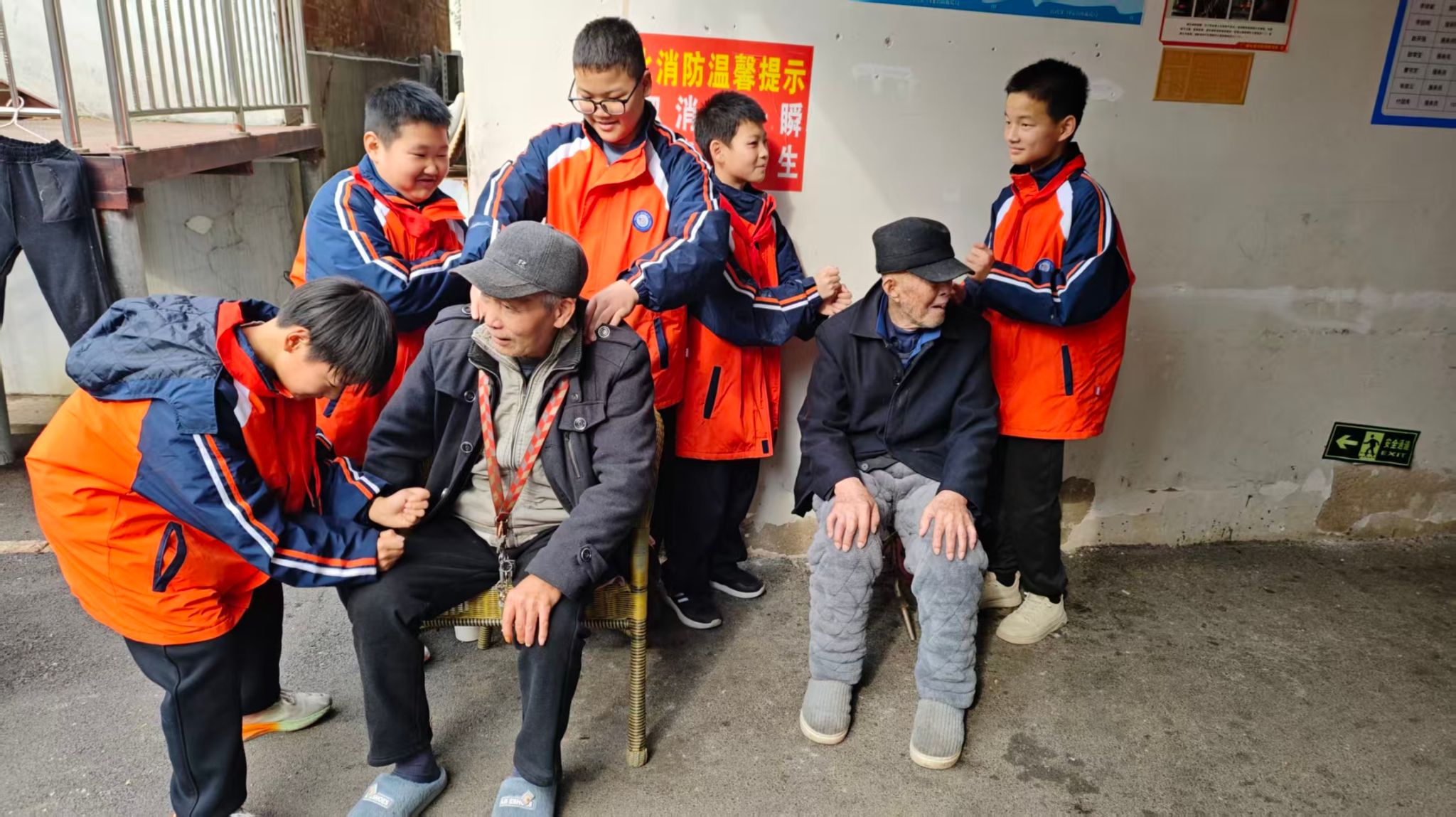 清扫过后,庭院里的氛围愈发热闹。孩子们围坐在老人身边,像一群叽叽喳喳的小麻雀,绘声绘色地分享着校园里的趣事——课堂上的小插曲、运动会上的奋力奔跑、和小伙伴的欢乐游戏,老人们听得津津有味,脸上的皱纹都笑成了花。还有孩子主动拉起老人的手,轻轻为他们捏肩捶腿,手法虽略显生疏,动作却格外轻柔用心,老人们的眼中满是欣慰与感动。