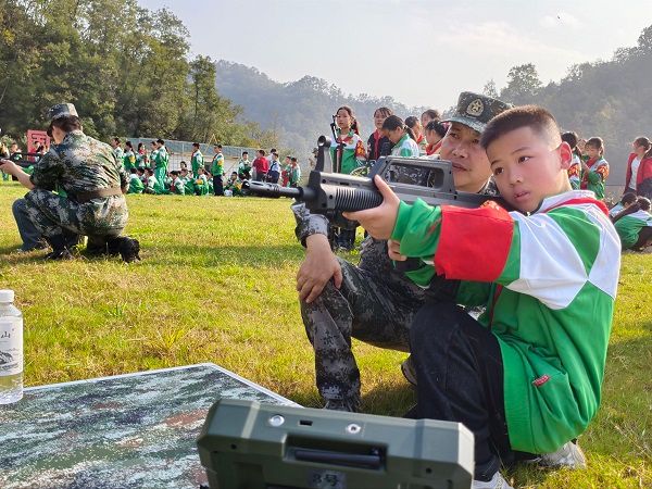 本次研学活动最精彩的环节当属轻武器操作训练。在专门设置的射击训练区,教官们详细讲解了枪支的基本构造、安全规范和操作要领。“双膝触地,右手握枪,左手托住枪身。”教官一边讲解,一边示范。随后,学生们分组进行实操训练。教官们单膝跪地在学生身边,手把手纠正动作,确保每个孩子都能掌握基本要领。当学生们终于能够稳定瞄准靶心时,脸上都露出了自豪的笑容。