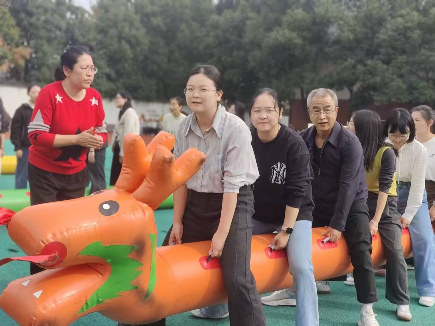 团体赛率先点燃赛场热情。“旱地龙舟”上,队员们手挽手、脚并脚,喊着整齐口号奋勇争先,靠默契“划”出速度;“车轮滚滚”环节,大家踩着布“轮”稳步前行,无人抢快掉队,满眼都是“同心共赢”的坚定;“水到渠成”接力传递管道接球,小失误引来阵阵欢笑,老师们却互不抱怨、互相打气。平日温文尔雅的教书匠,此刻化身活力四射的“运动达人”,赛场边加油声浪此起彼伏,尽显丹小温暖与活力。