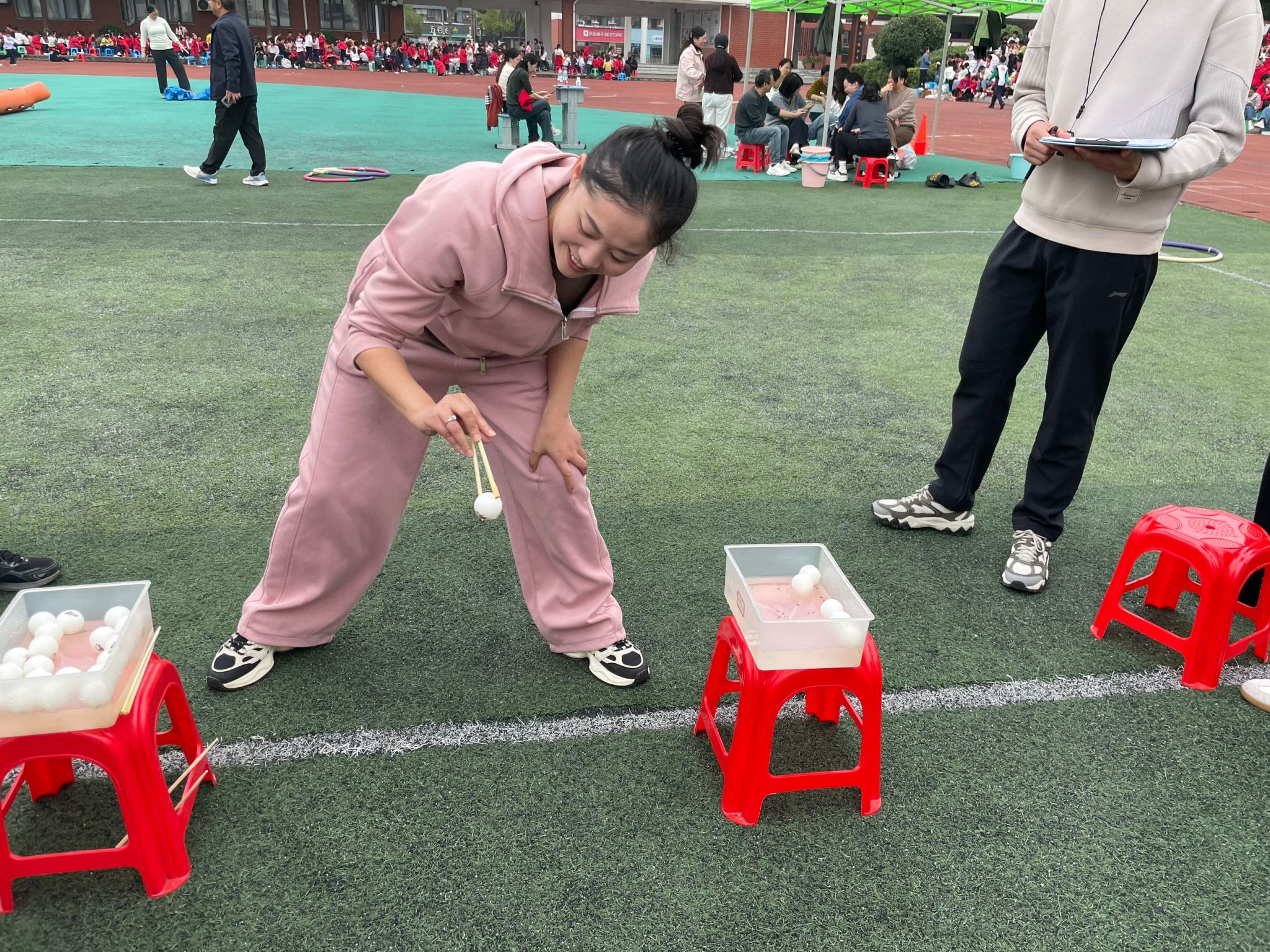个人赛同样精彩纷呈。“一分钟跳绳”赛场,绳子甩得“呼呼”作响,老师们脚步轻快、越跳越劲;“夹乒乓球”时,大家屏息凝神,用筷子稳稳夹球,即便偶尔掉球也笑着重拾出发;“定点投篮”篮筐前,命中者引来欢呼,未中者也收获队友“下一个准进”的鼓励。裁判们认真计时计分,而无论最终名次如何,老师们的笑容始终未断——输赢无关紧要,动起来、乐起来才是真谛。