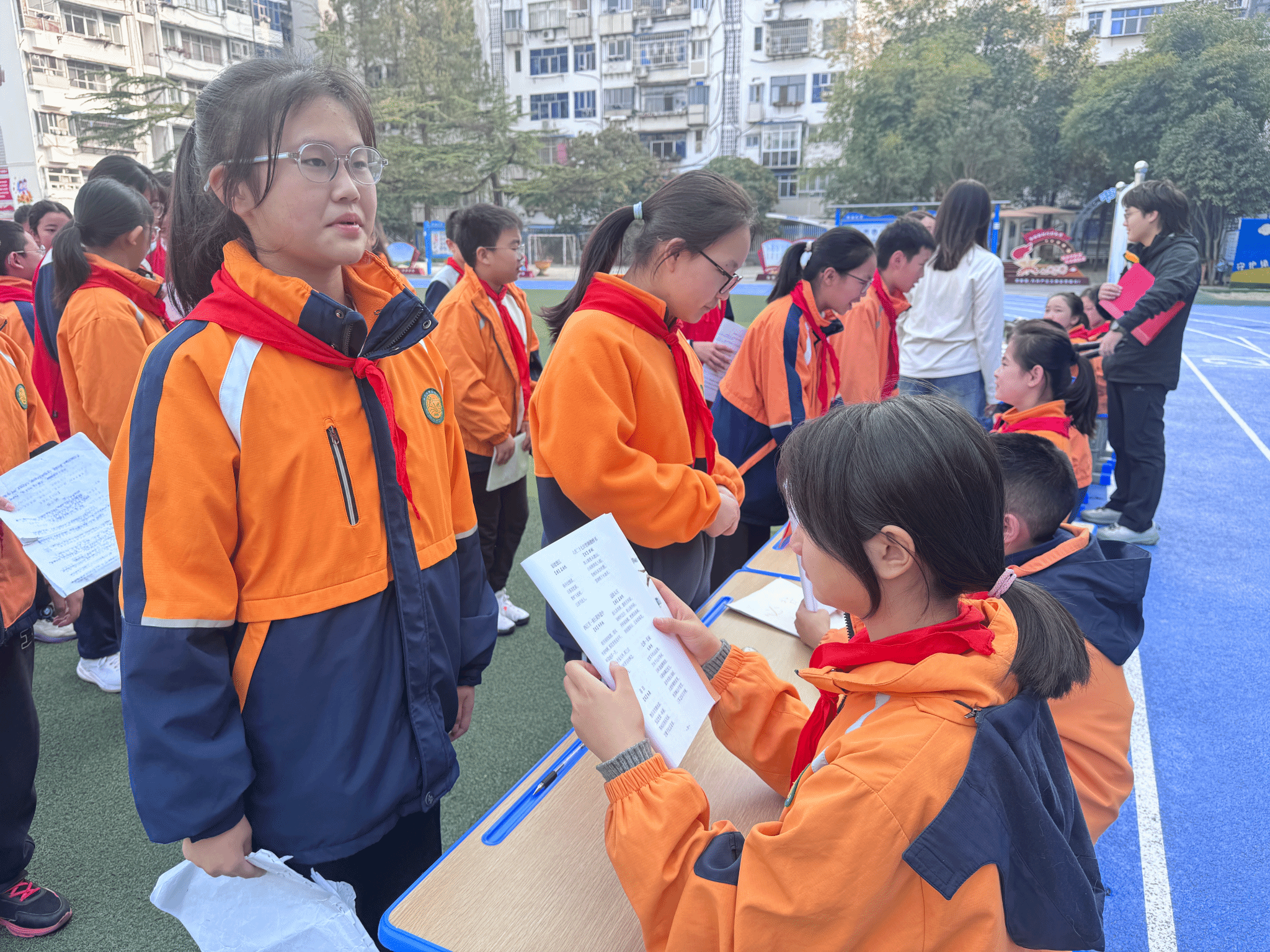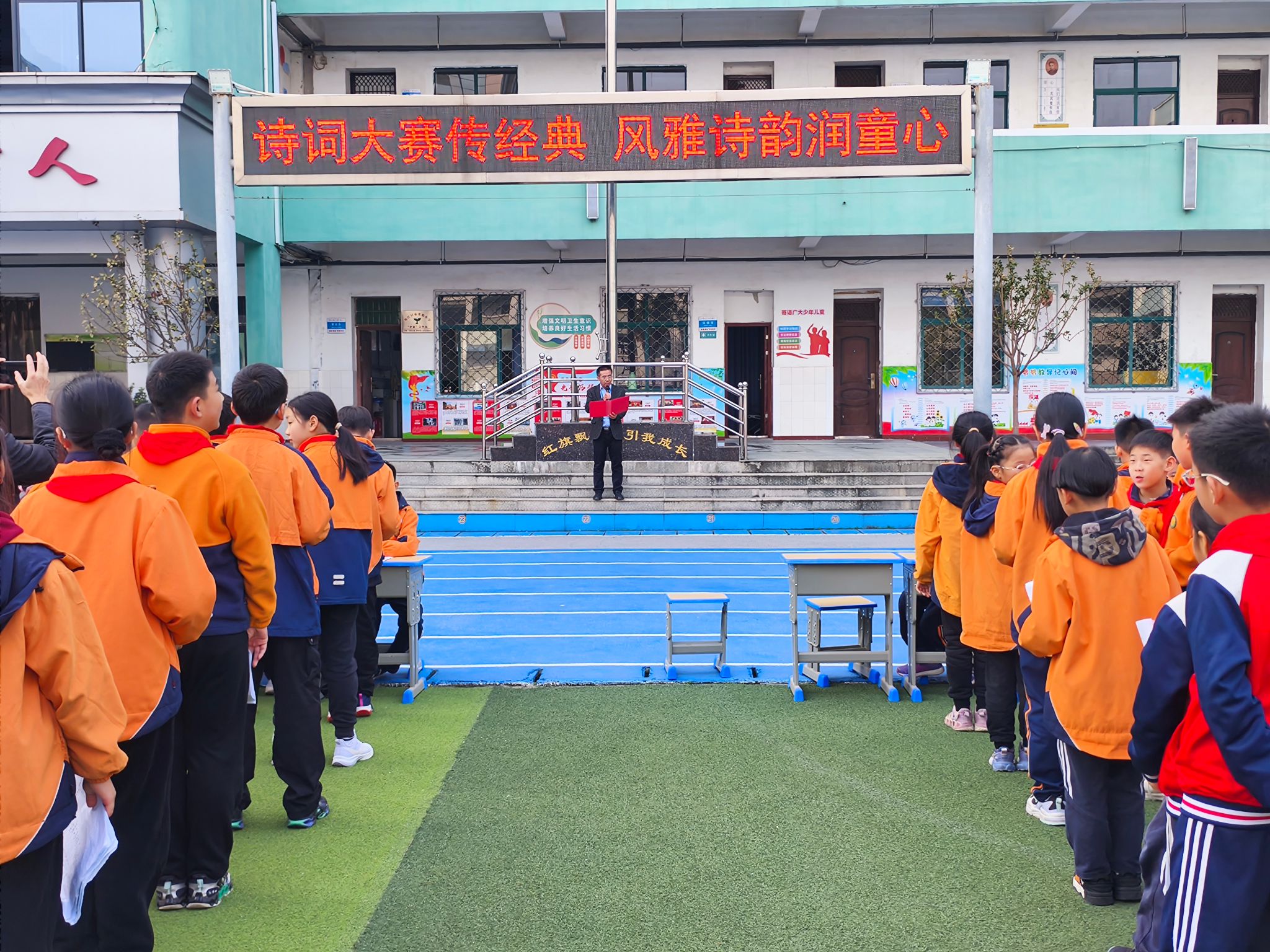 考级当天,活动分教室与操场两个场地进行。教室内,当节课教师与3名学生考官组成考核小组,对学生进行直接考核;操场上,由语文老师推荐的各班5名学生代表,在对应级别的教师与学生考官前,展开了激烈的校级考级挑战,同时展现出了同学们流畅的背诵节奏、充沛的情感以及大方的仪态,充分体现了他们对古诗词的扎实积累与深刻理解。