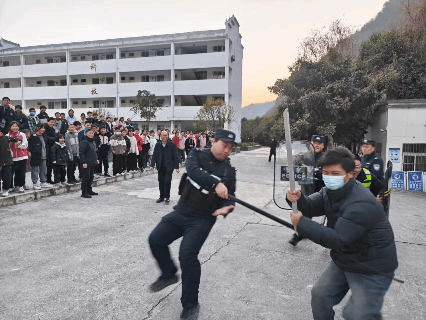 派出所民警和学校护校成员和“歹徒”搏斗中