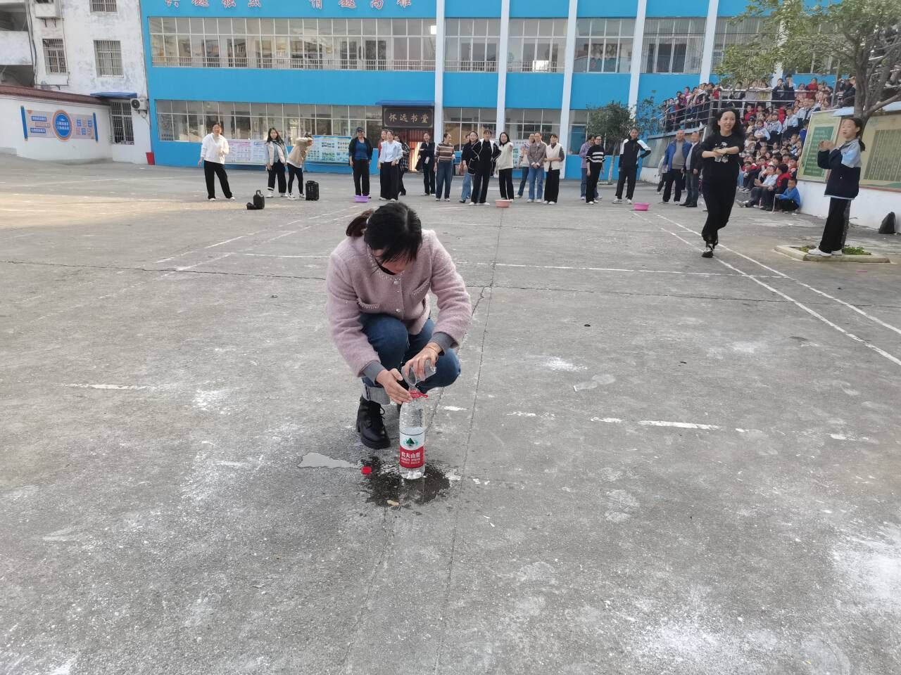 “南水北调”项目无疑是本次运动会的焦点。赛道上,老师们手中那看似微不足道的一次性水杯,此刻却成了承载责任与使命的方舟。他们小心翼翼地护着杯中那一汪清水,仿佛守护着丹江口水库的每一滴精华,运至20米外的矿泉水瓶中。大家屏气凝神,眼神专注,每一次交接都精准而迅速。偶尔有清水洒落,那瞬间的惋惜不仅是为了比赛,更是源于内心深处对水资源的珍视。这个项目不仅考验着老师们的平衡与协作,更让作为丹江口人的他们,对“南水北调”这一宏伟工程有了切肤之感。这小小的水杯,让他们真切体会到,宏伟的工程正是由无数个这样微小而关键的环节构成。每一次成功的传递,都是对“一江清水永续北送”的庄严承诺。在奔跑与协作中,守护源头活水的责任与自豪,已深深烙印在每个人的心中。