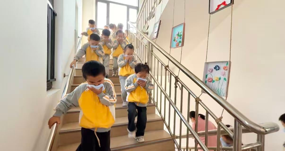 演练启动后,随着消防警报响起,各班教师反应迅速,立即引导幼儿用提前备好的湿毛巾捂住口鼻,以弯腰低头姿势快速跟进,沿着教学楼两侧安全通道向操场撤离,全程指令清晰、行动高效、安全有序。