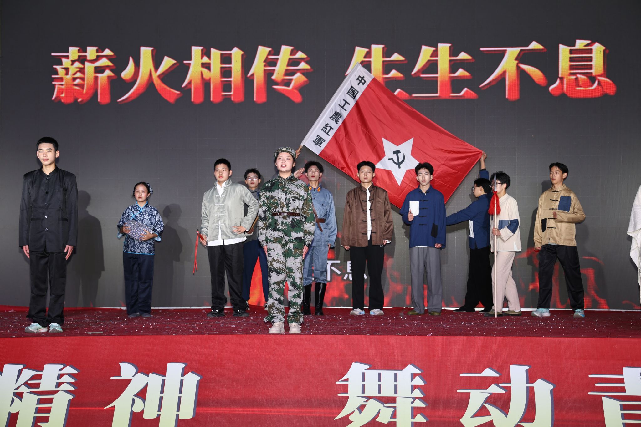 梦想在艺术中绽放。晚上的文艺汇演将此次活动推上高潮。晚会紧扣“传承三大精神”核心主题,通过朗诵、舞蹈、歌曲、相声、情景剧等丰富多元的艺术形式,全方位、多角度呈现精神内涵与时代价值。晚会现场,一幕幕感人场景震撼呈现:抗疫先锋与志愿者们舍小家为大家,用坚守与奉献再现 2019 年新冠疫情来袭时,万众一心、共克时艰的抗疫精神;党员干部与人民子弟兵如抗洪英雄高建成一般义无反顾冲向1998年特大洪水一线,以无畏担当诠释危难时刻挺身而出的抗洪精神;革命先烈冯正觉、林清芝母女的忠魂被深情追忆,学生们更是将冯正觉“革命总有牺牲”的豪迈气概演绎得淋漓尽致,让红色奉献精神直抵人心。声情并茂的朗诵、衣袂翻飞的舞蹈、激昂奋进的歌曲、诙谐幽默的相声、情感真挚的情景剧,让不朽的精神在舞台上熠熠生辉,在心灵中深深扎根。