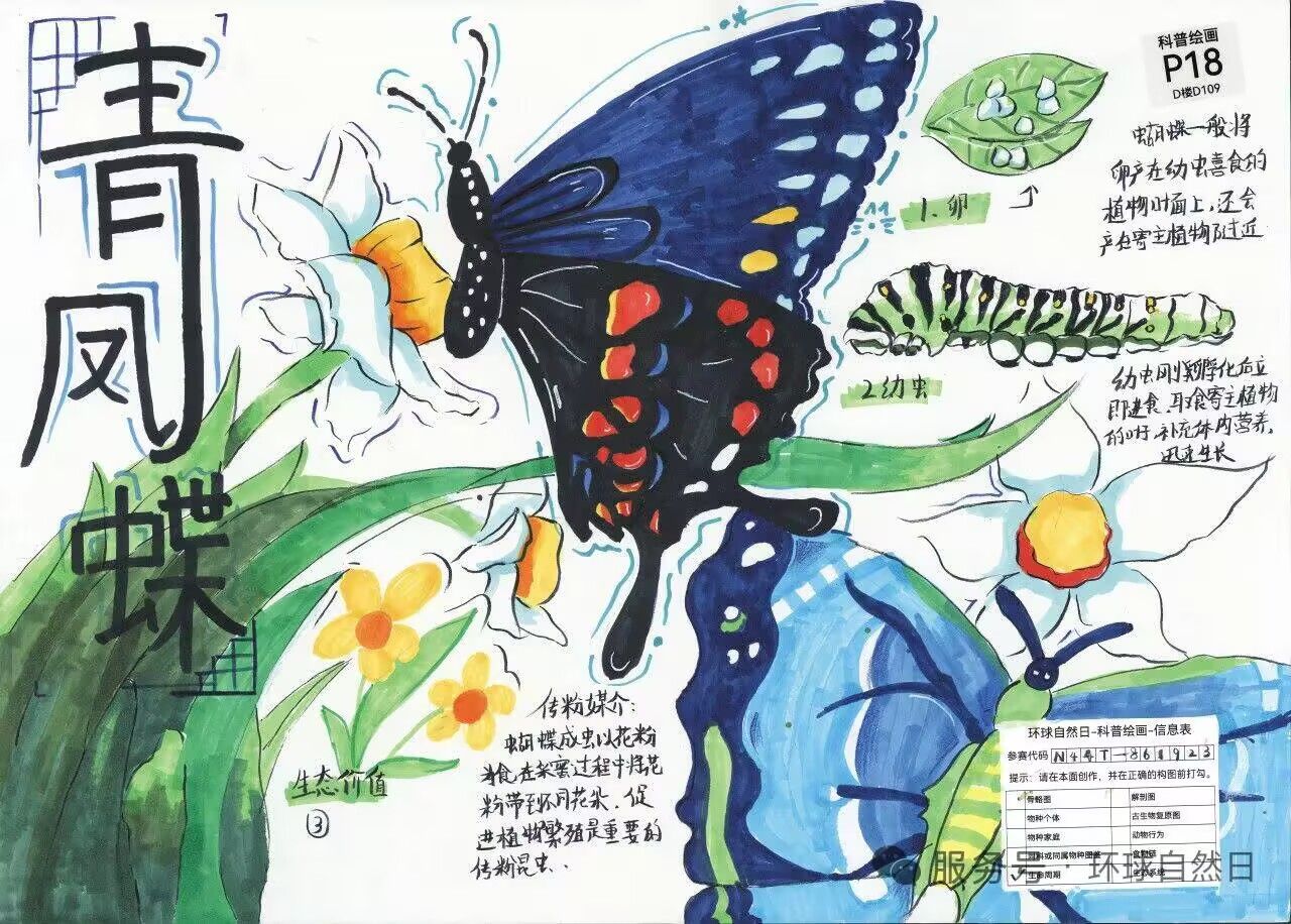熊雨桐同学的《青凤蝶》锚定昆虫生长核心阶段,以“卵———幼虫”为切入点,用鲜活插画标注习性细节,还点明其传粉的生态价值,科学精准又生动。两幅作品均以“微观自然”为载体,既守牢科学严谨性,又借艺术表达让科普更鲜活,是“观察+创作”双能力的精彩落地。