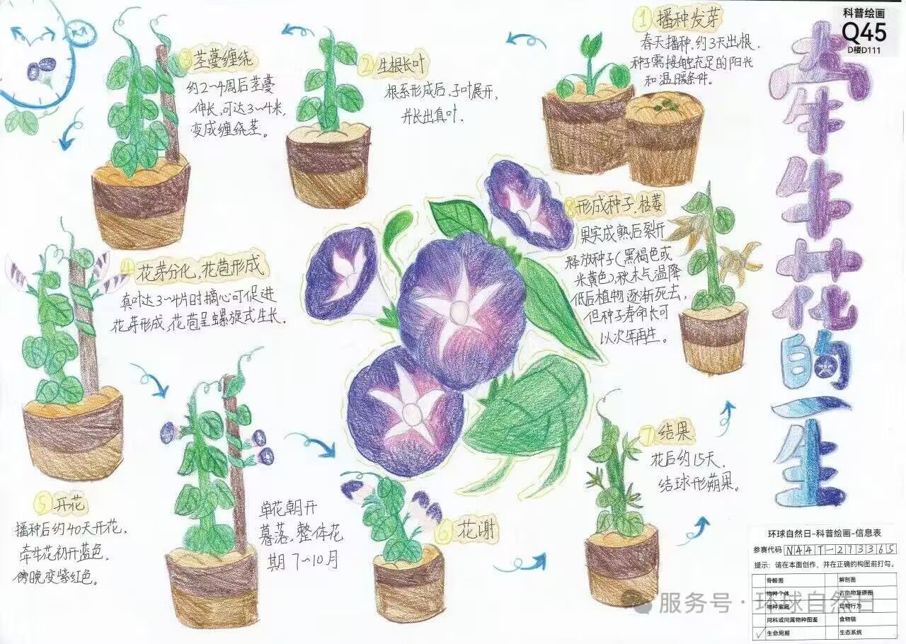 决赛现场,参赛者分别进行不同类别的展示,枝江市丹阳小学两名学子参与科普绘画角逐。她们专注的神情、灵动的笔触,不仅展现出对自然科学的深刻理解,更传递出少年对生命世界的敬畏与热爱,这两幅作品在众多参赛作品中脱颖而出,赢得评委与现场观众的一致好评。李颖菲同学创作的《牵牛花的一生》完整串起植物全周期,从播种到结籽的7个环节清晰铺展,配色贴合物种特点,时序逻辑一目了然。