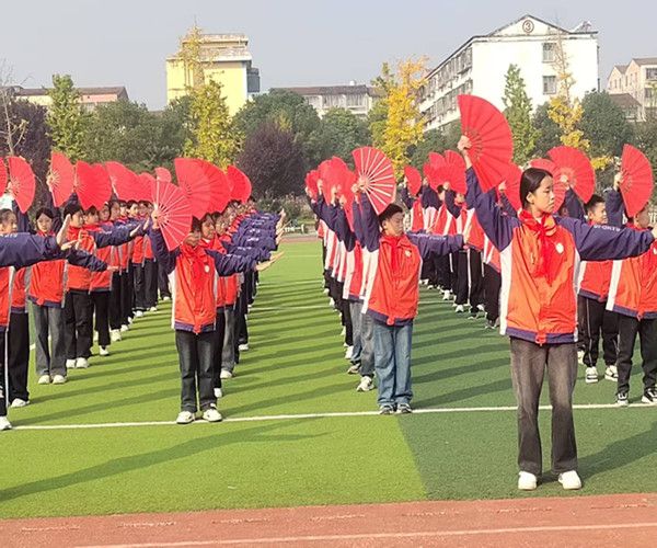 高年级的同学们则带来了扇子操与渔鼓操的精彩演绎。手持红色折扇的同学们,开合之间尽显少年意气,扇面翻飞如蝶舞,动作刚劲有力又不失柔美,将《弟子规》中“兄道友,弟道恭;兄弟睦,孝在中”的处世之道融入一招一式,展现出蓬勃的朝气与深厚的文化底蕴。而渔鼓操的表演更是独具韵味,同学们手持渔鼓,时而轻敲鼓面,时而转动鼓柄,动作整齐划一,配合着朗朗的诵读声,古韵悠长,让人仿佛穿越千年,感受传统文化的博大精深。