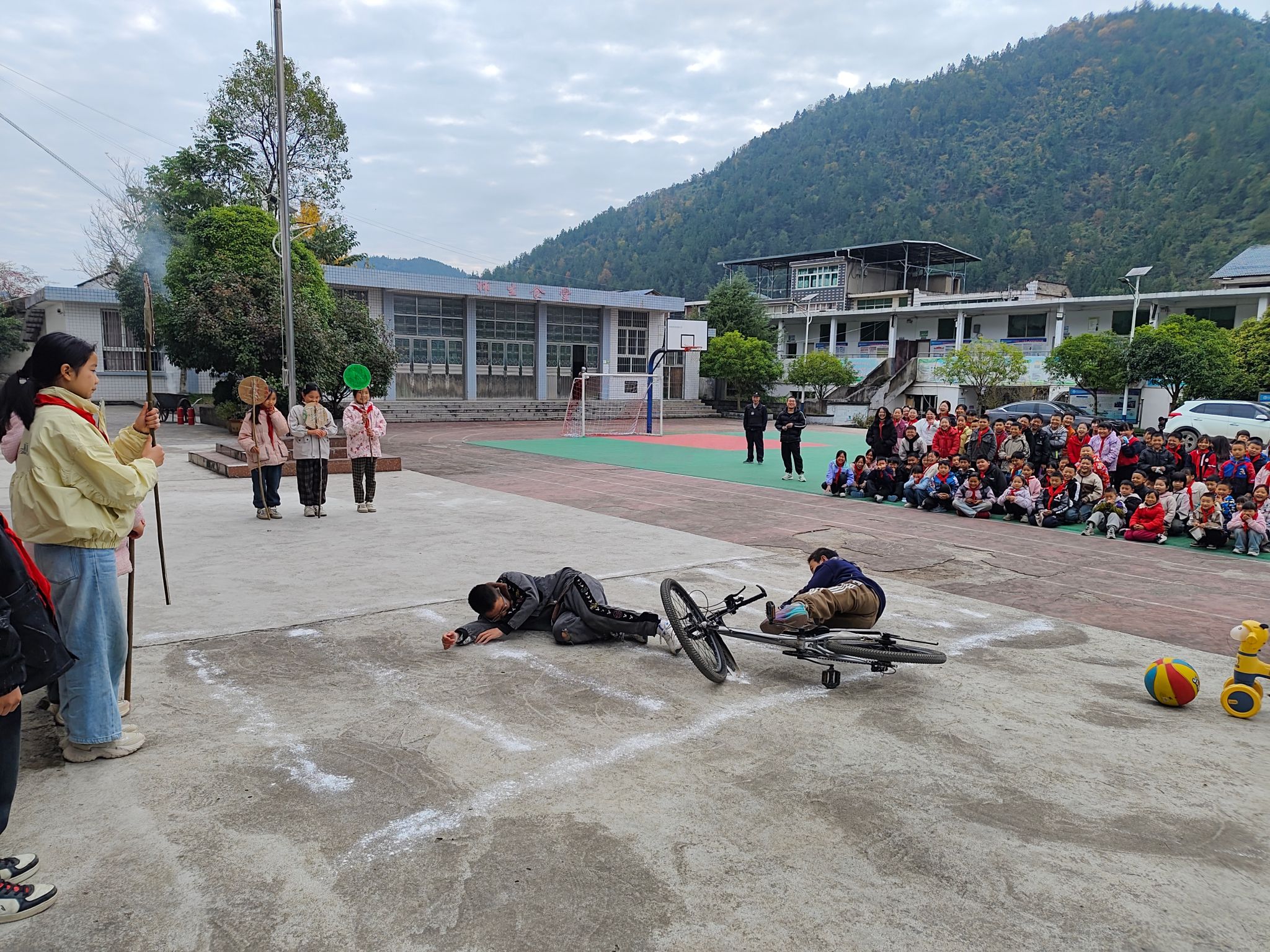 地处偏远山区的小栋坝小学,学生们日常接触的交通环境相对简单,对于城市中常见的信号灯、斑马线、交通标志等设施较为陌生。面对这一实际情况,学校决定因地制宜,创新教育形式。活动中,学生们化身“小演员”,在老师的指导下,精心排练了多个情景剧。