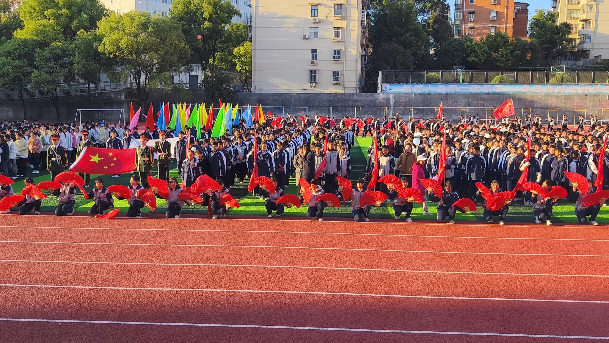 开幕式在庄严的升旗仪式中拉开帷幕。伴随着雄壮的《运动员进行曲》,由学生组成的仪仗队迈着整齐有力的步伐入场。国旗手们精神抖擞,一丝不苟地护送五星红旗入场,充分展现了城关一中学子的爱国情怀和良好风貌。紧随其后的是运动会会旗和由40名同学组成的彩旗方阵,五颜六色的彩旗迎风飘扬,象征着丰富多彩的校园生活。会场跑道两侧,彩扇队和花环队挥舞着鲜红的彩扇和花环,上下翻飞,如同两道绚丽的彩虹,营造出热烈欢快的氛围。