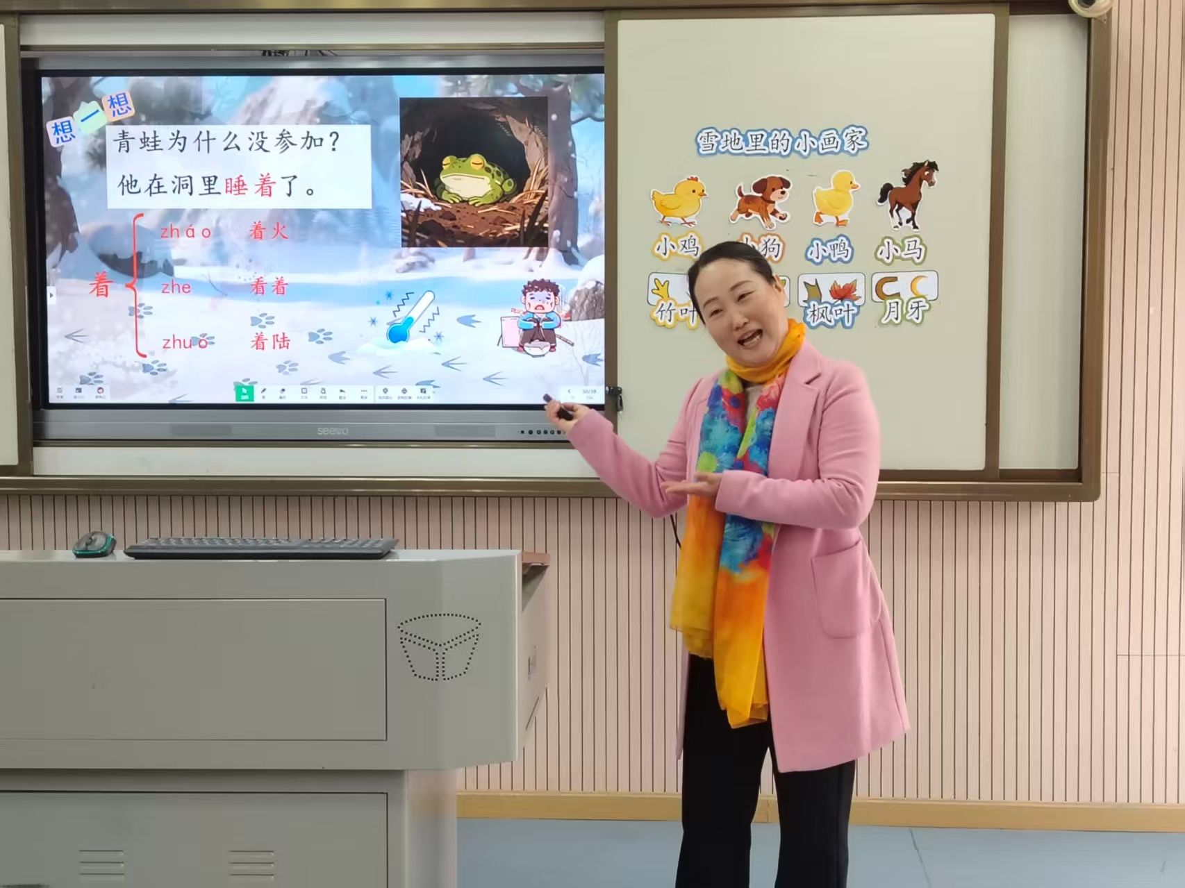 活动现场,三节特色示范课率先拉开序幕。工作室核心成员蒋梅花老师执教一年级语文《雪地里的小画家》,以童趣化语言搭建文学审美桥梁;骨干成员杨琴老师的二年级音乐《洋娃娃和小熊跳舞》,用节奏律动点燃艺术热情;高阳小学刘小平老师的四年级科学《风向和风力》,以实操探究解锁科学奥秘。三节课跨越学科边界,却始终围绕“素养培育”核心,为在场教师呈现了“各美其美、美美与共”的课堂样态。