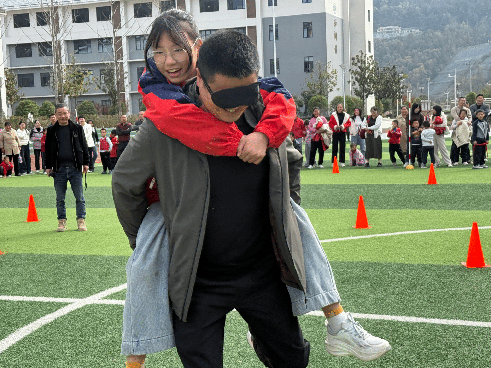 同步举办的趣味亲子活动,成为家校互动的亮点。家长与孩子组队参与两人三足、你投我接、过河搭桥、小小引路人、我的爸爸妈妈等趣味项目,赛场上欢呼声、加油声此起彼伏。亲子间默契配合、携手闯关,在运动中增进了情感联结。