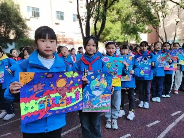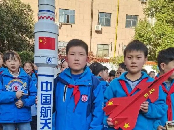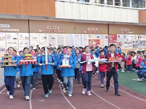伴随激昂音乐,各年级特色方阵依次登场。一年级“科学创意绘画”方阵中,孩子们手举画作,“会飞的校园”“海底实验室”等画面满是童真遐想,家长纷纷拍照记录;二、三年级“科学知识展报”方阵,展报上太阳系轨迹、动植物生长知识图文并茂,尽显孩子们对科学的探索;四年级“航模作品”方阵格外吸睛,身着蓝色马甲的学生手托自制飞机、火箭模型,步伐坚定,传递飞天梦想;五年级“环保作品”方阵用废旧材料制作“机器人”“雨水收集器”,诠释“科技赋能环保”;六年级“科学小制作”方阵的简易发电机、迷你红绿灯,展现扎实动手能力。“我也要做火箭模型!”二年级李明宇的话,道出孩子们的热情。