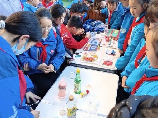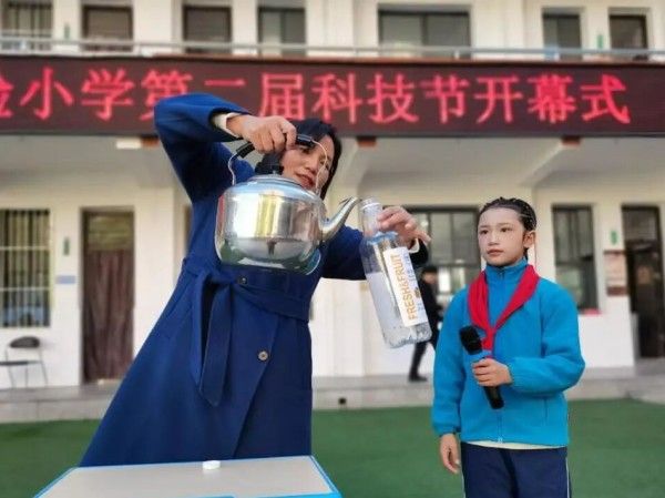 方阵巡礼后,“实验流动集市”成为高潮。四个实验摊位前挤满学生,志愿者老师与家长耐心指导。“彩虹形成”实验中,三棱镜折射出七彩光,孩子们惊呼不已,老师趁机讲解光的折射原理;“瓶子吹气球”实验里,小苏打与白醋反应让气球“鼓肚”,孩子们争相尝试;“水中浮针”实验通过对比操作,让孩子理解水的表面张力;“热胀冷缩”实验中,加热后的金属球无法穿过金属环,老师用“金属球变胖”的比喻科普原理。“比课本直观有趣!”五年级王梓涵说。家长们或协助分发材料,或与孩子共同操作,亲子互动让科学知识更鲜活。