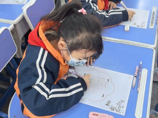 随着比赛指令下达,选手们坐姿端正、握笔规范,凝神静气地投入书写。三年级学子笔下的《望洞庭》稚嫩却工整,四年级同学书写的《暮江吟》笔画舒展,六年级选手则以刚劲笔触诠释《六月二十七日望湖楼醉书》的豪情。40分钟的赛程中,唯有笔尖划过纸面的“沙沙”声,一幅幅卷面整洁、字迹秀美的作品在同学们的精心书写下逐渐成型。