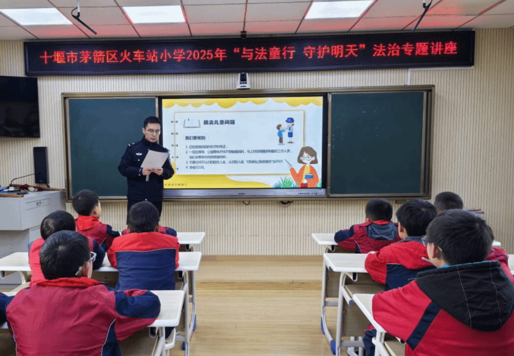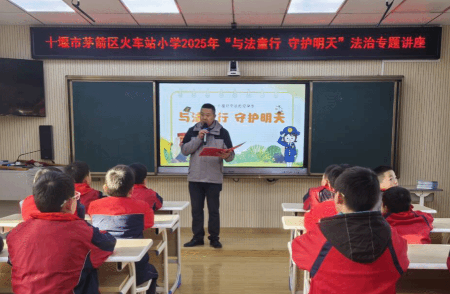 为深入贯彻法治理念,提升学生法律意识与自我保护能力,2025年12月3日,在“国家宪法日”来临之际,十堰市茅箭区火车站小学特邀市公安局茅箭分局人民路派出所社区民警阮亮亮警官来校,开展“与法童行 守护明天”主题法治教育讲座。