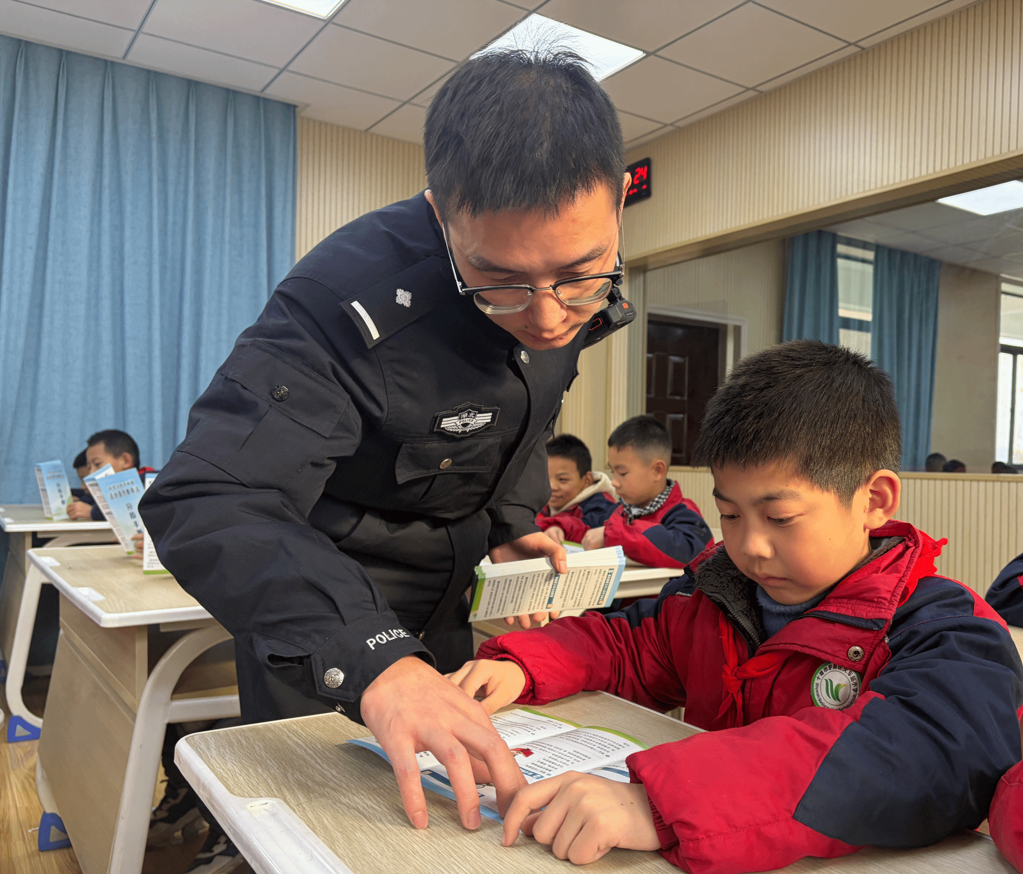 阮警官还向学生发放了法治宣传手册,希望他们不仅自己学习,更能担任班级法治宣传员,积极向同学和家人传播法律知识,共同营造遵纪守法、和谐安全的校园与家庭环境。孩子们积极响应,表示将在班级认真宣传法治知识。