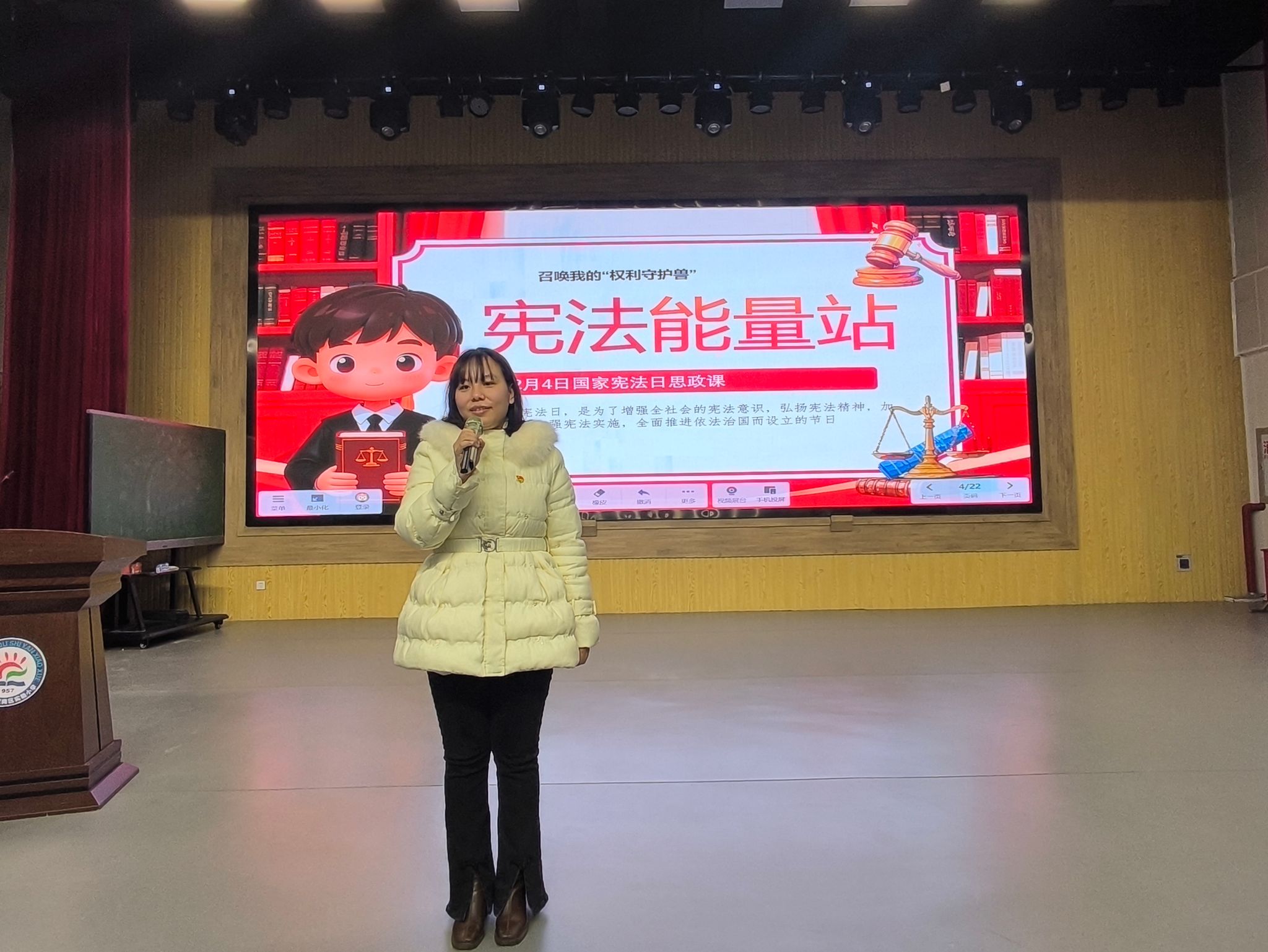 活动现场,周洁老师以《宪法能量站——召唤我的“权利守护兽”》为题,带来了一堂生动有趣的宪法日思政课。周老师结合小学生的认知特点,通过生动的案例讲解、图文并茂的课件展示,用通俗易懂的语言向同学们介绍了《中华人民共和国宪法》的地位和核心内容,让大家明白宪法是国家的根本大法,与每个人的生活息息相关。从校园生活中的行为规范到社会生活中的权利义务,周老师将抽象的法律条文转化为贴近学生生活的具体事例,引导同学们树立“学法、懂法、守法、用法”的意识。