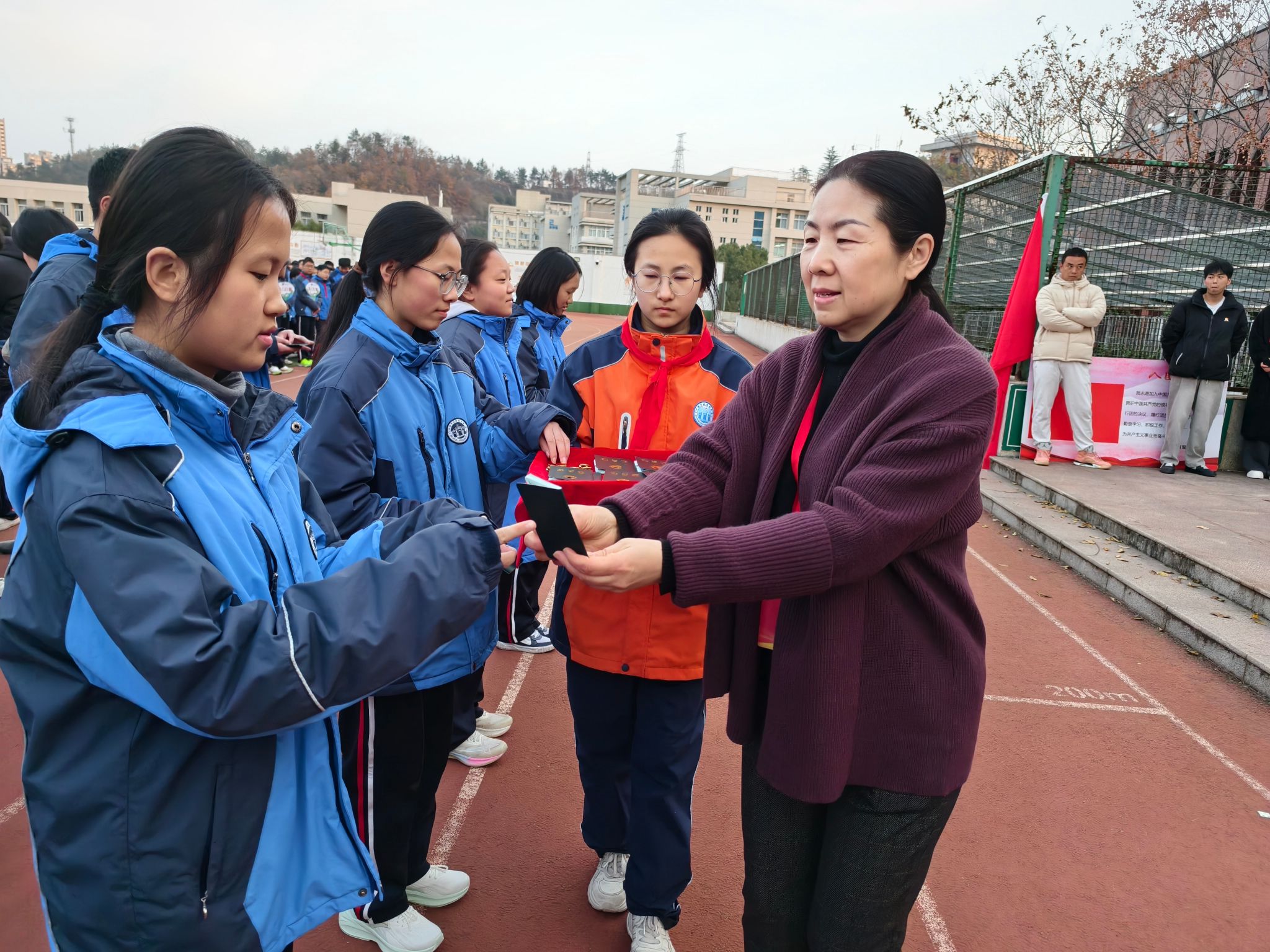 在全校师生的共同见证下,校领导为新团员逐一佩戴团徽、颁发团员证。那一枚枚闪亮的团徽,不仅是荣誉的象征,更是责任的标志。新团员们神情庄重,眼中闪烁着自豪与坚定。