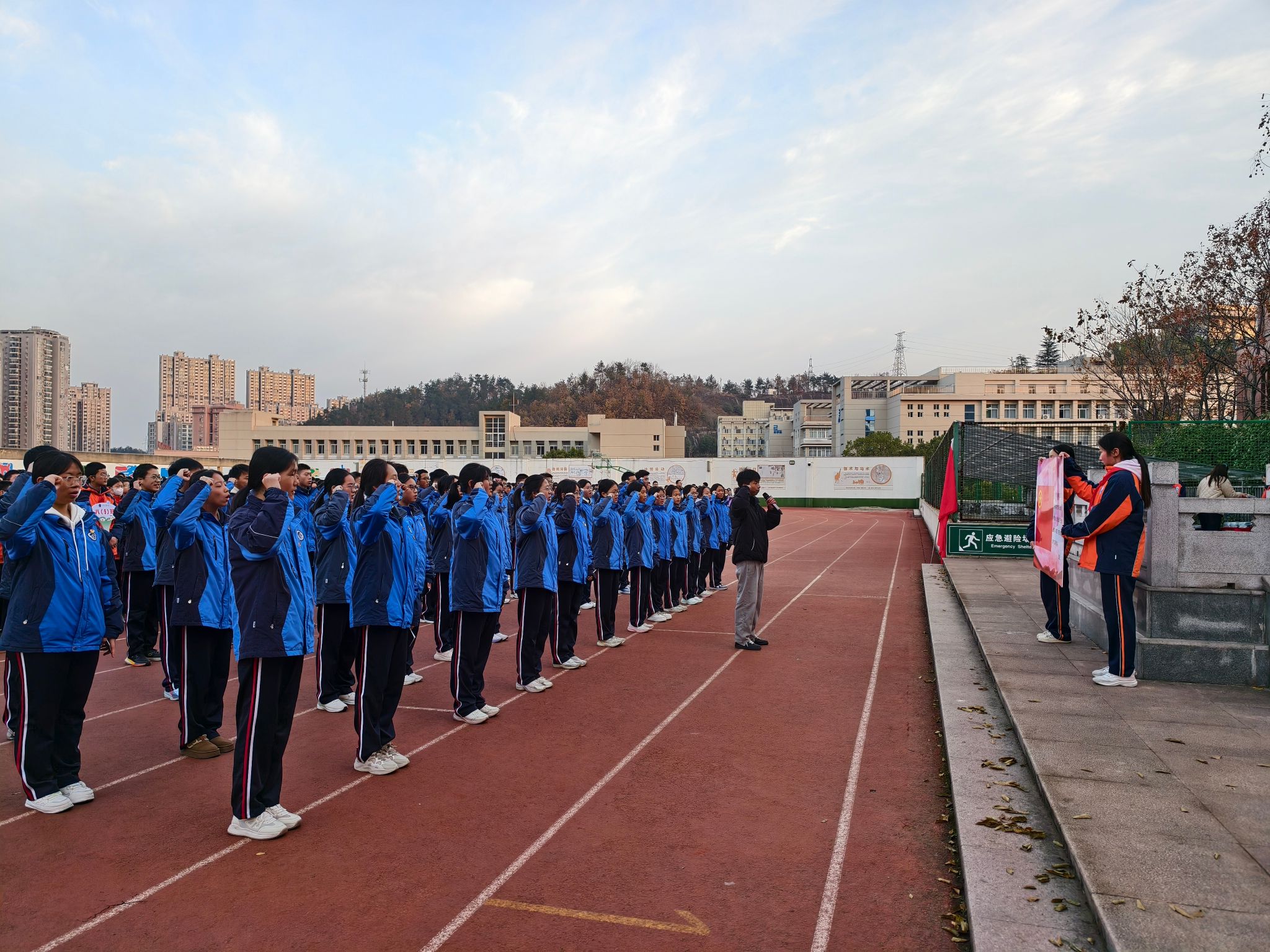 “九十年前,一群爱国青年走上街头,为民族独立和国家命运奔走呐喊;如今,党的二十届四中全会为青年指引方向,‘十五五’规划为青春搭建舞台,我们站在这里,接续他们那份为国担当的精神。”仪式在庄严的国歌声中开启,五星红旗缓缓升起,全体师生肃立行礼。这一刻,历史的厚重与青春的朝气交汇在一起。校团委书记赵婷以深情讲述,将“一二·九”运动的历史意义与当代青年的使命紧密连接,引导同学们思考:新时代的青年应当如何传承这份爱国情怀与奋斗精神?