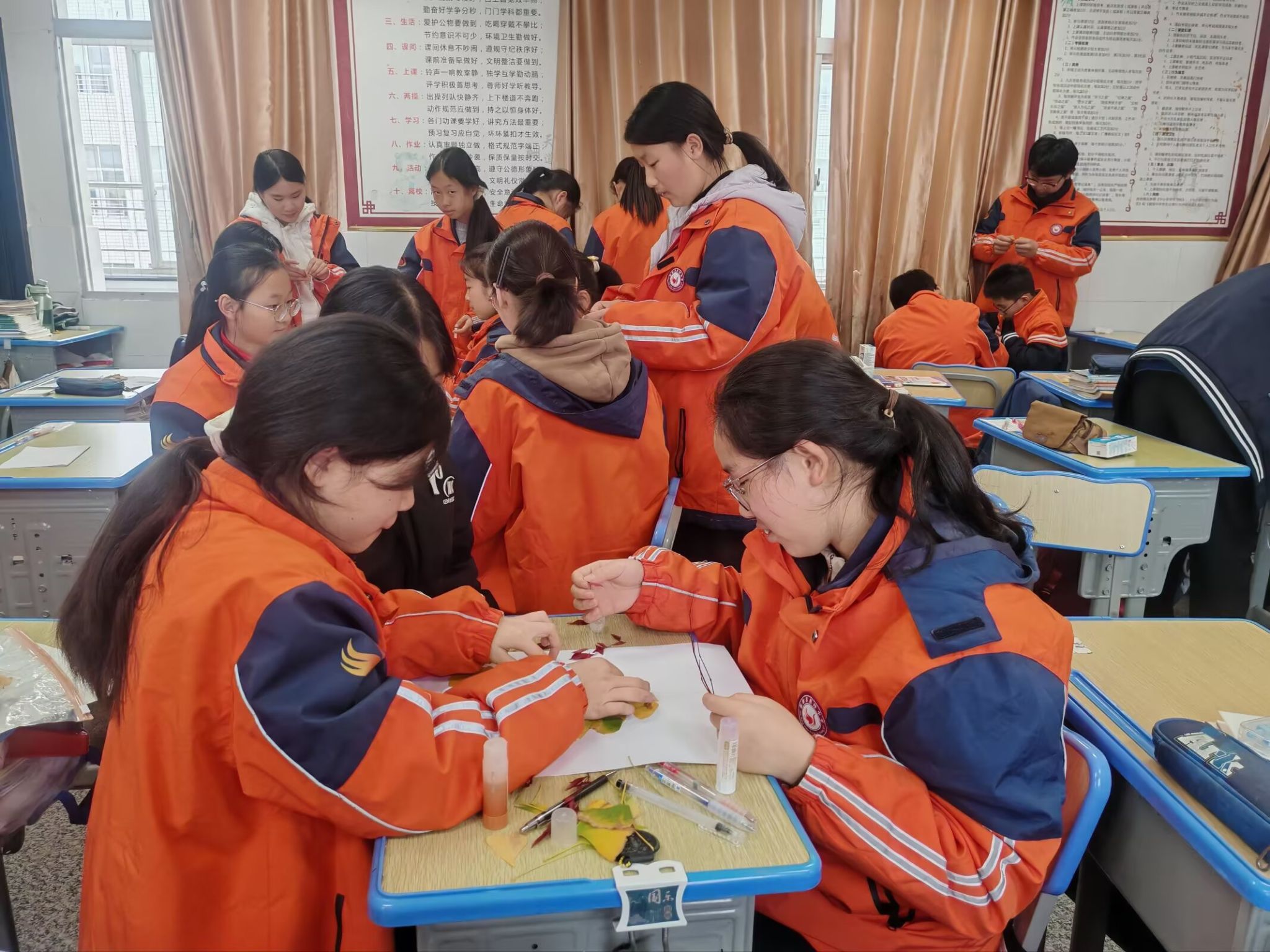 创作过程中,美术老师巡回指导,针对部分作品构图失衡、色彩搭配不协调等问题精准支招,助力学生将美术理论转化为创作实践。同学们则相互分享技巧、交流灵感,在协作中提升艺术表达能力。“原来一片普通的落叶,通过巧妙的色彩搭配和形态组合,能变成这么特别的艺术品!”八年级学生陈欣怡举着自己的作品兴奋地说,这次活动让她真切感受到了生活中随处可见的美。