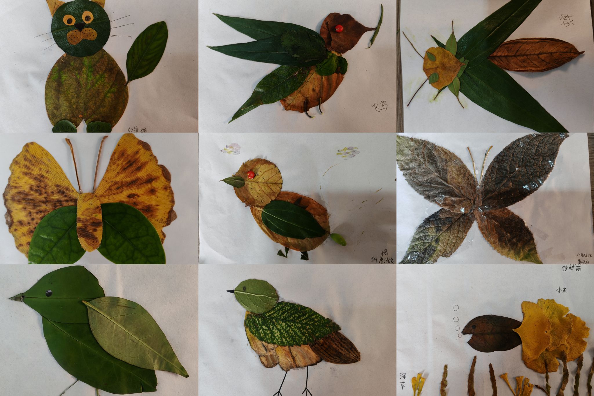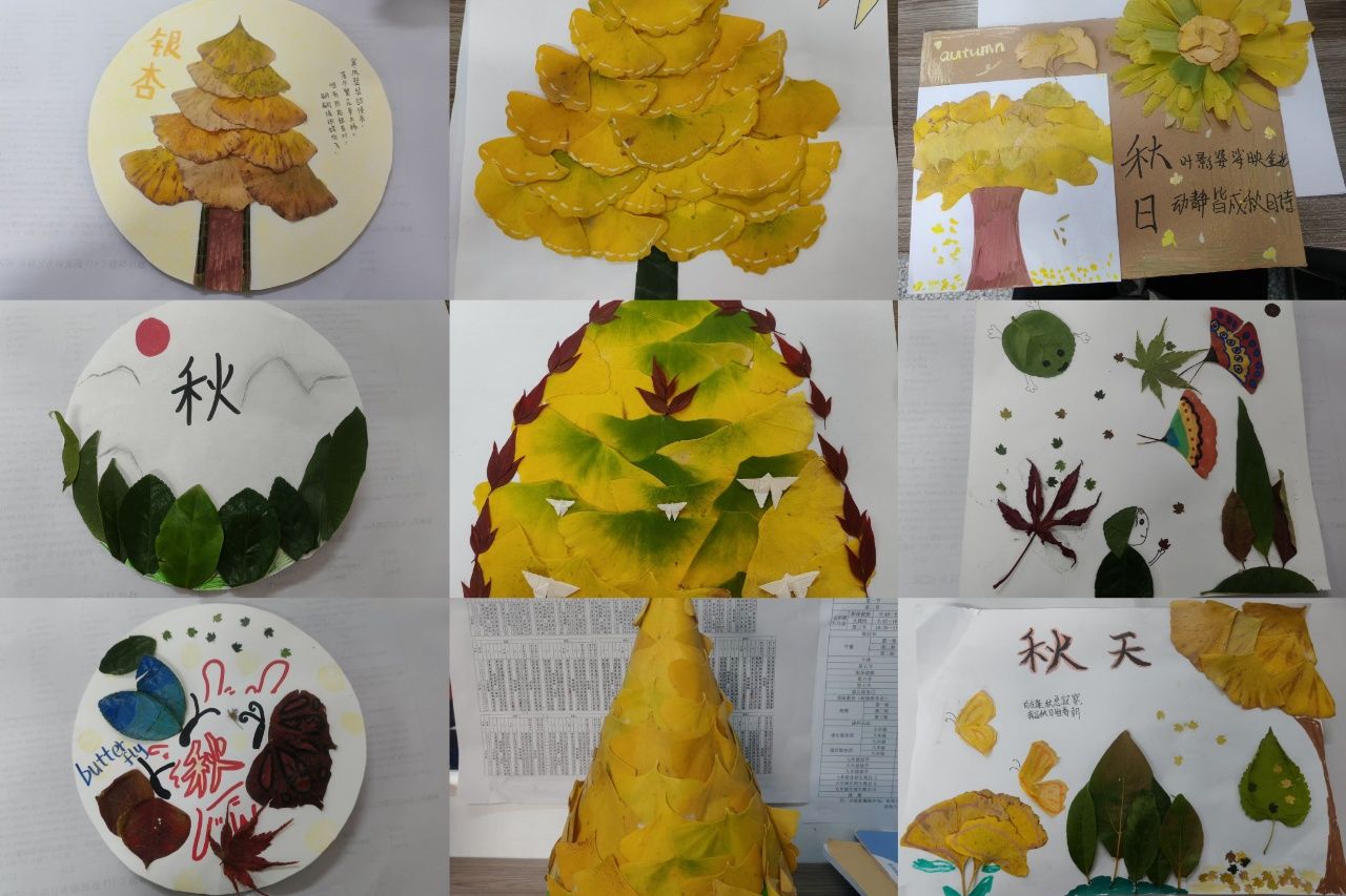 创作现场俨然一座充满童趣的“秋日艺术工坊”,热闹而有序。同学们以小组为单位分工协作,有的负责筛选叶片、有的构思构图、有的动手粘贴,奇思妙想在交流中不断迸发。一片片形态各异的落叶,在同学们的巧手中被赋予全新生命力:蓬松的落叶花团搭配彩色小旗,尽显秋日热闹;层层叠叠的叶片堆叠成山峦,纸蝶轻落其间,仿佛在诉说秋的私语;灵动的小动物、精致的尖顶小帽、叶脉清晰的树木……每一件作品都充满巧思。更有同学在拼贴作品旁附上原创小诗,让金黄的落叶成为笔尖流淌的诗意,将整个秋天的浪漫都揉进了这方寸画纸之中。