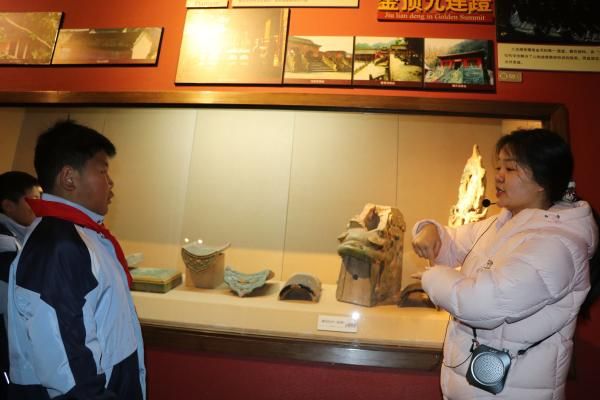 在“仙山琼阁武当山”主题展区,武当建筑群的精致模型和道教文物让学生们驻足流连。孩子们不仅认真聆听讲解,更展现出强烈的探究精神。当看到屋脊神兽装饰时,四二班樊晨曦同学好奇地提问:“老师,狻猊和螭吻的区别是什么?”研学老师随即耐心细致地讲解:狻猊是龙子之一,喜静好坐,常出现在香炉脚部;螭吻则是口阔好吞,常用于殿脊两端,寓意镇火避灾。老师生动形象的解说,让这些古建筑构件顿时鲜活起来,引来周围同学阵阵赞叹。“我以前和爸爸妈妈去过武当山,但今天才知道这些建筑背后藏着这么多学问。”四二班杨嘉宝同学兴奋地说道。