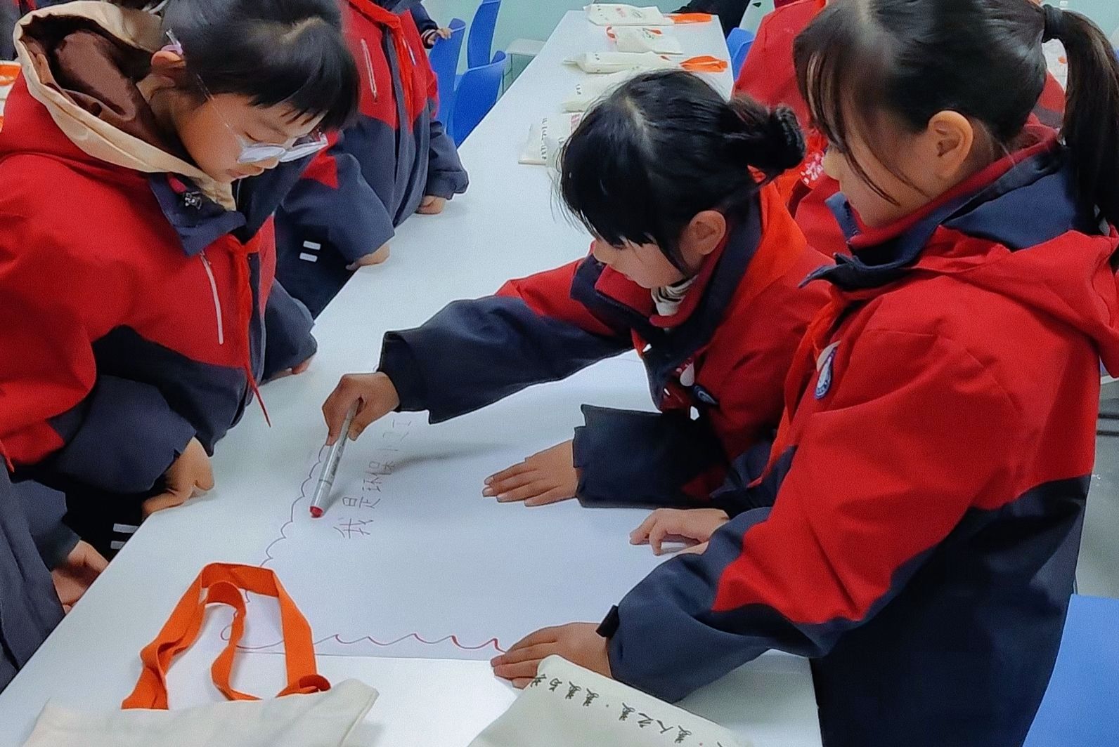本次活动特别设置了“书香满桌阅读分享会”环节。美美社工教师带领同学们共读环保绘本《都是放屁惹的祸》,并组织开展环保海报设计活动。学生胡玉阳在分享自己的海报时说:“我画的是骑自行车上学,标语是‘少开一天车,多留一片蓝’!”来自康明斯的志愿者也分享了个人成长与环保实践的故事,鼓励同学们从小树立绿色生活理念。